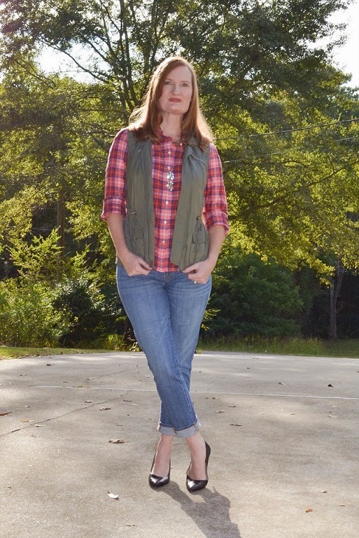 Do you have a utility vest? I have worn this one quite a few times aleady. It’s a Chico’s vest and bought it from a consignment shop. I wore it in the late summer with short and a tee, then several times so far this Fall season. It’s a versatile piece. You can even wear utility vests with casual dresses. Here, I paired it with a plaid shirt and jeans, both from J. Crew Factory. The heels dressed it up a bit.