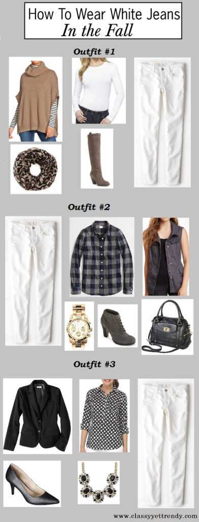 To create an outfit with white jeans, I always remember to wear a darker top. That way, you add color and it offsets the pale white jeans. In Outfit #1, the main focus is on the camel-colored sweater poncho. For Outfit #2, I wanted to build the outfit around the utility vest. In Outfit #3, the main piece is the black blazer.