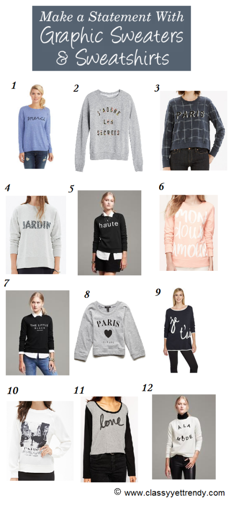 Did you all wear a graphic tee this past Spring and Summer? Even though the weather has turned chilly, we can still wear our graphic tops and stay warm! Have you seen how I styled my “Adore” sweatshirt from Old Navy here in this blog post? I believe the Adore sweater is now sold out because I can’t locate it on Old Navy’s site online. I’ve searched the internet for some graphic sweaters and sweatshirts that are available. I’ve included links just below to take your directly to the item pages.