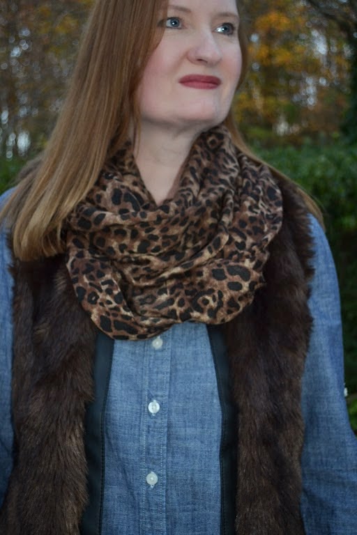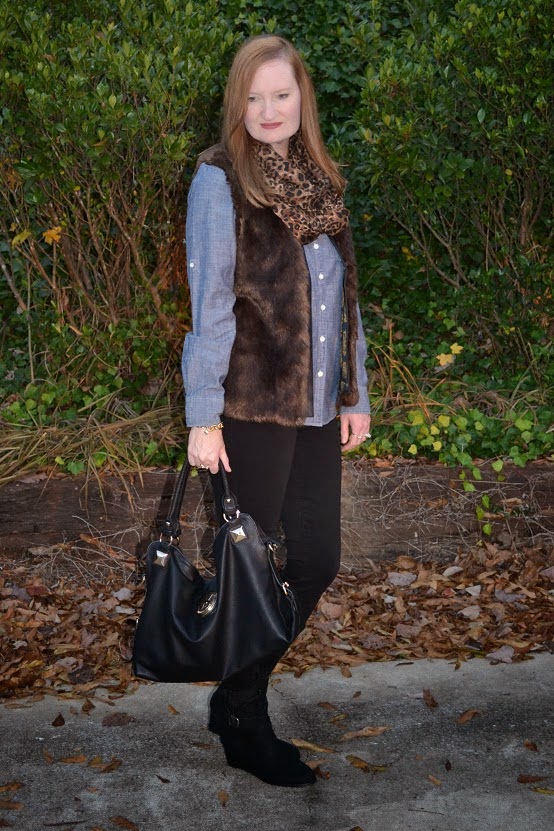 Sorry for being so late to link up! It has been such a busy week! The fur vest with the chambray shirt and leopard print scarf is such a classic outfit this fall!