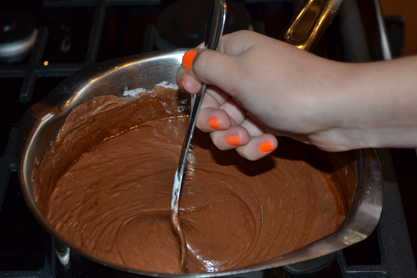 At this point, if you have a daughter, she’ll probably come into the kitchen and want to help stir in the chocolate and see it turn into gooey liquid fudge!