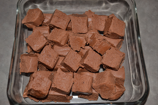 Here’s a tip: When you get ready to cut into pieces, take a plate, flip it over and sit it on top of the fudge. Hold the baking dish and plate together and flip over. Lift up the baking dish. Peel the foil off the fudge. This makes it easier to cut into squares.