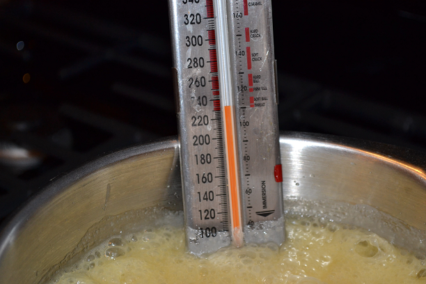 Boil the mixture until the thermometer reaches 234 degrees, stirring constantly so the mixture won’t stick to the bottom of the saucepan. Remove from heat.