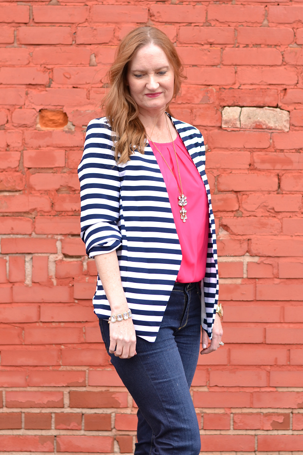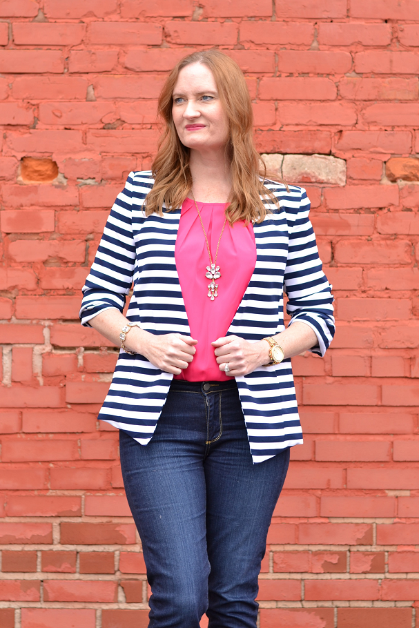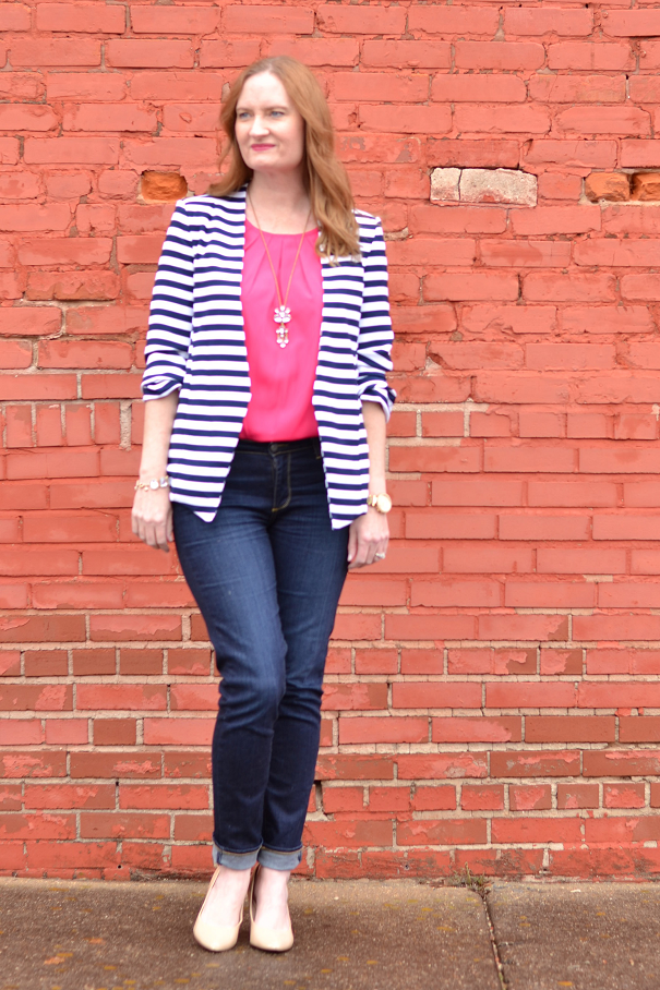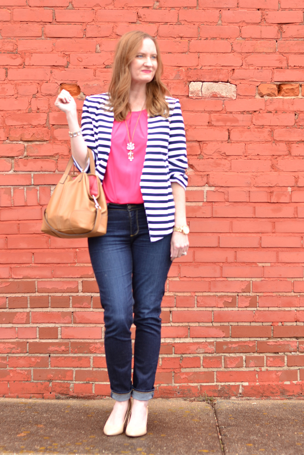 Love that striped blazer. I was going through my closet this weekend and realizing that all of my top pieces – cardigans, blazers, etc. are solids. I need to fix that!!