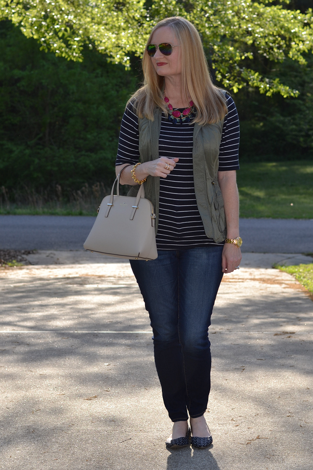 I'm loving the stripes with this military vest, and the necklace you chose is a perfect touch!