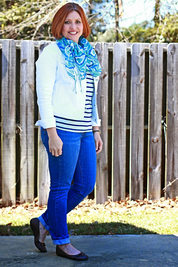Her denim jacket looks flawless with the striped top, jeans and scarf!
