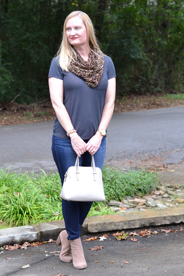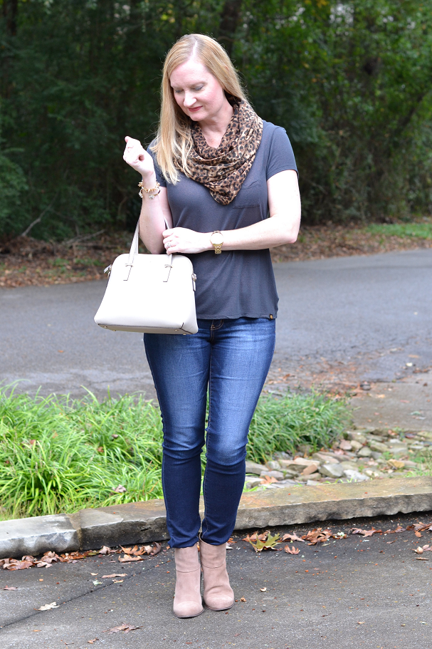 The days are getting cooler here in the South (finally!) and the leaves are starting to fall. When I went out to take the pictures for this blog post, the weather was perfect. It was just starting to sprinkle rain, the air was cool and the sun was starting to set. My favorite way to transition to Fall is by wearing a tee, jeans, a scarf and booties. I carry a jacket with me just in case the weather gets cool.