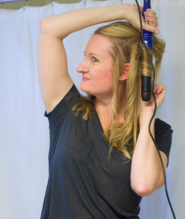 Here’s a few tips as you are curling your hair: 1. Be sure to hold the wand with the barrel pointing down, because when you release the hair from the barrel, the hair will fall straight down, holding the curl. 2. Curl the hair around your face away from you. Then with the next strand, curl the hair toward your face. It creates more volume. (see photo below)