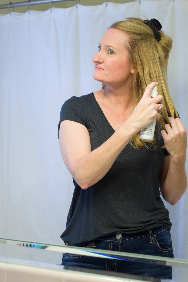 You’ll need to curl the bottom of your hair first, so pull your hair up into a clip on the top of your head. Spray the bottom part of your hair with heat protection spray. By using this spray, 1) it will protect your hair from being damaged by the heat, and 2) it will help hold the curl longer.