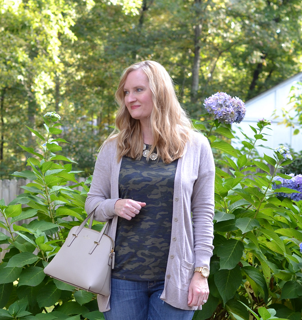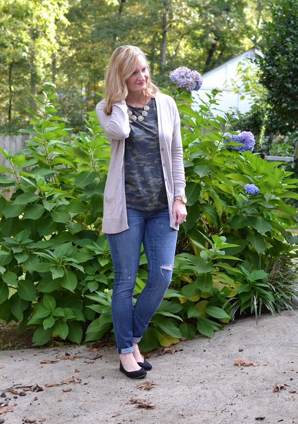 Although I’m not a hunter, I do like to wear an occasional camo tee and I’m craving some camo jeans! The other day, I wore my camo tee with a cardigan and distressed jeans. I was in my backyard and snapped these photos.