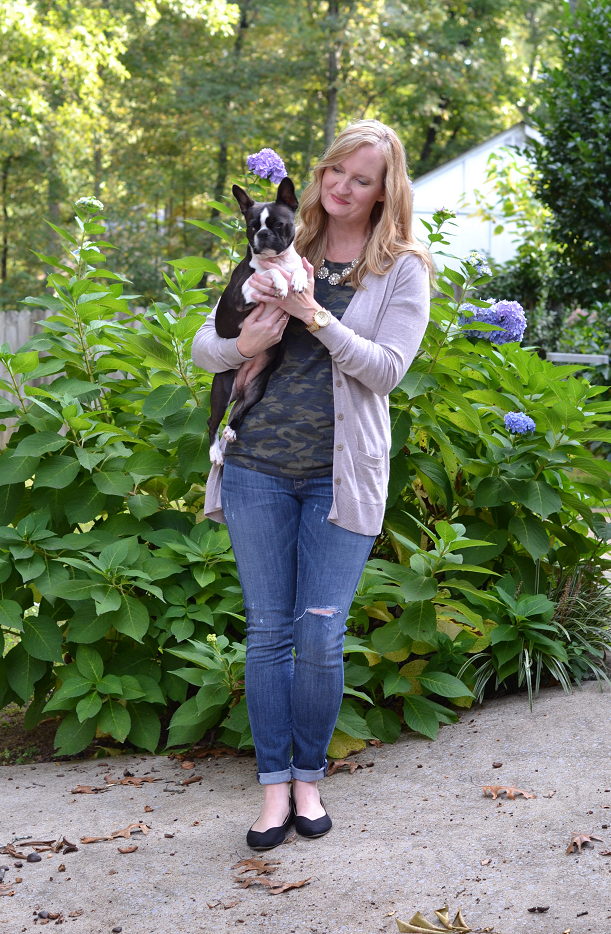 One of my favorites – camo – great look! And, I have to say your doggy is adorable. I grew up with a Boston Terrier, many in fact. My mom bred them. Very cute!
