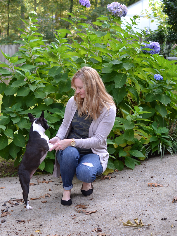 Aw, your doggy is so cute! Your outfit is great– I love how you 'girly-ed' up the camo!