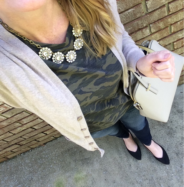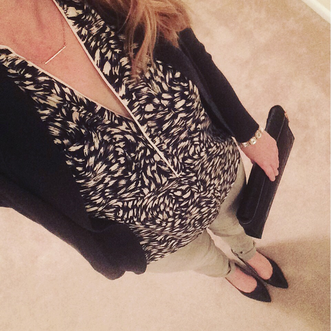 My favorite way to wear skinny jeans is to dress them up with heels. I wore this outfit to work the other day: H&M sleeveless navy print top with a navy cardigan, gray skinny jeans, black heels and black clutch.