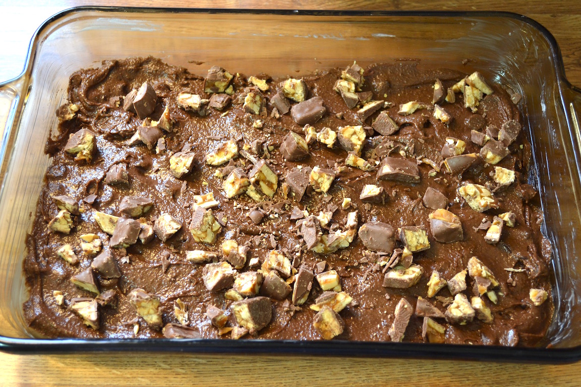 - Add the rest of the batter to the dish, covering the chopped SNICKERS® Minis.