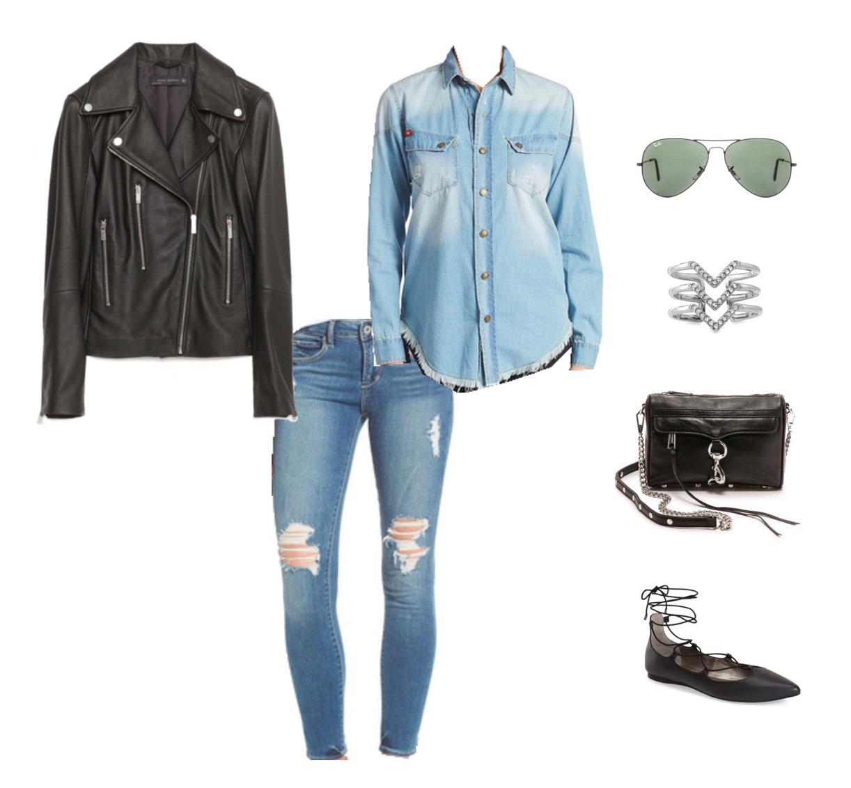 This outfit has a bit of edge to it, perfect for wearing out on a date or out on the town with friends. It features a frayed edge chambray shirt, faux leather moto jacket, distressed jeans, aviator sunglasses, silver chevron ring, Rebecca Minkoff MAC bag and black lace-up flats.
