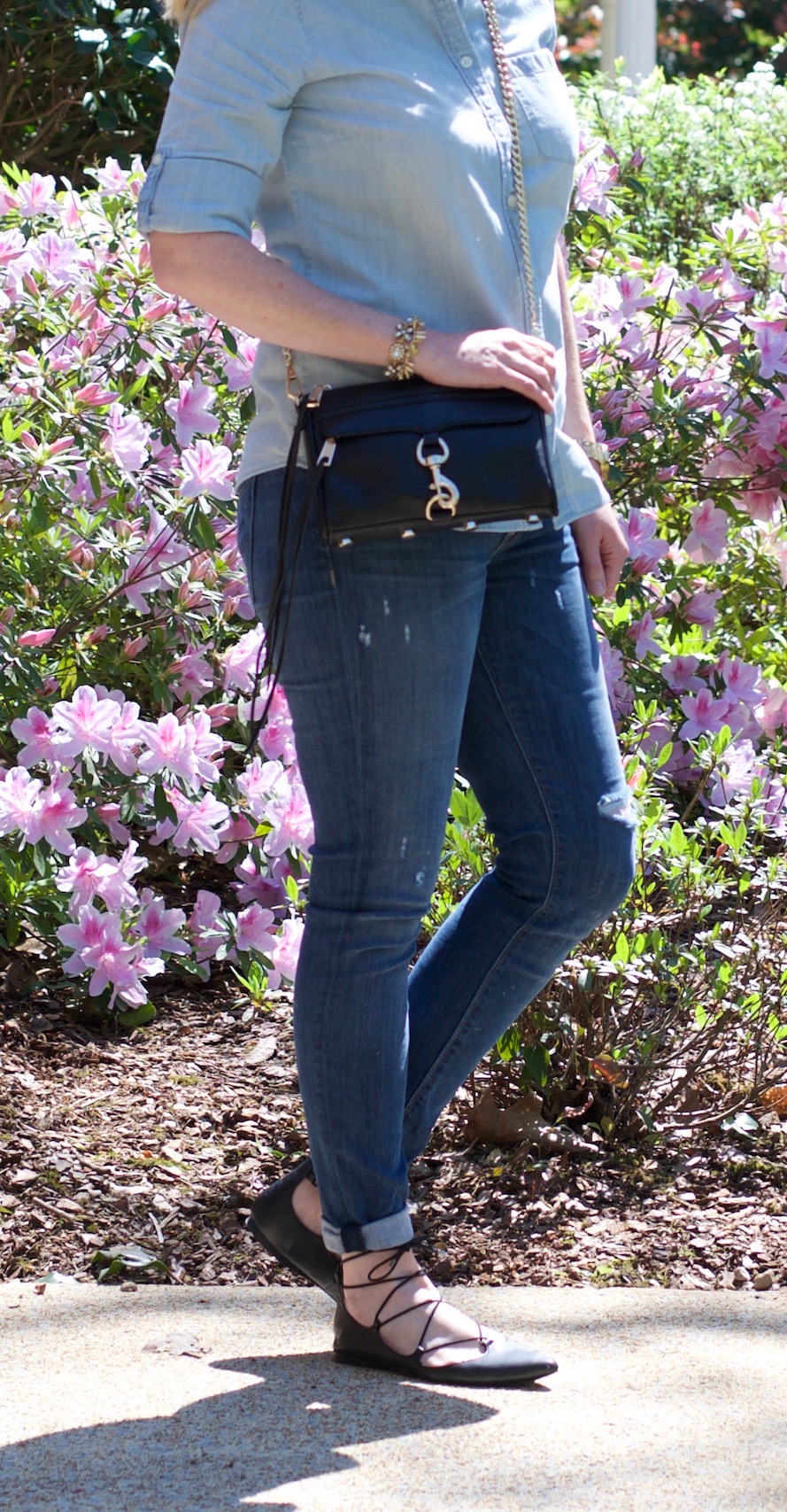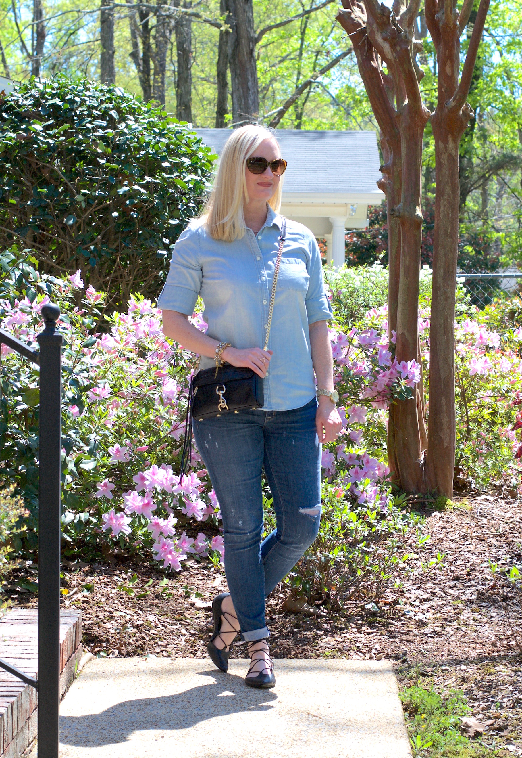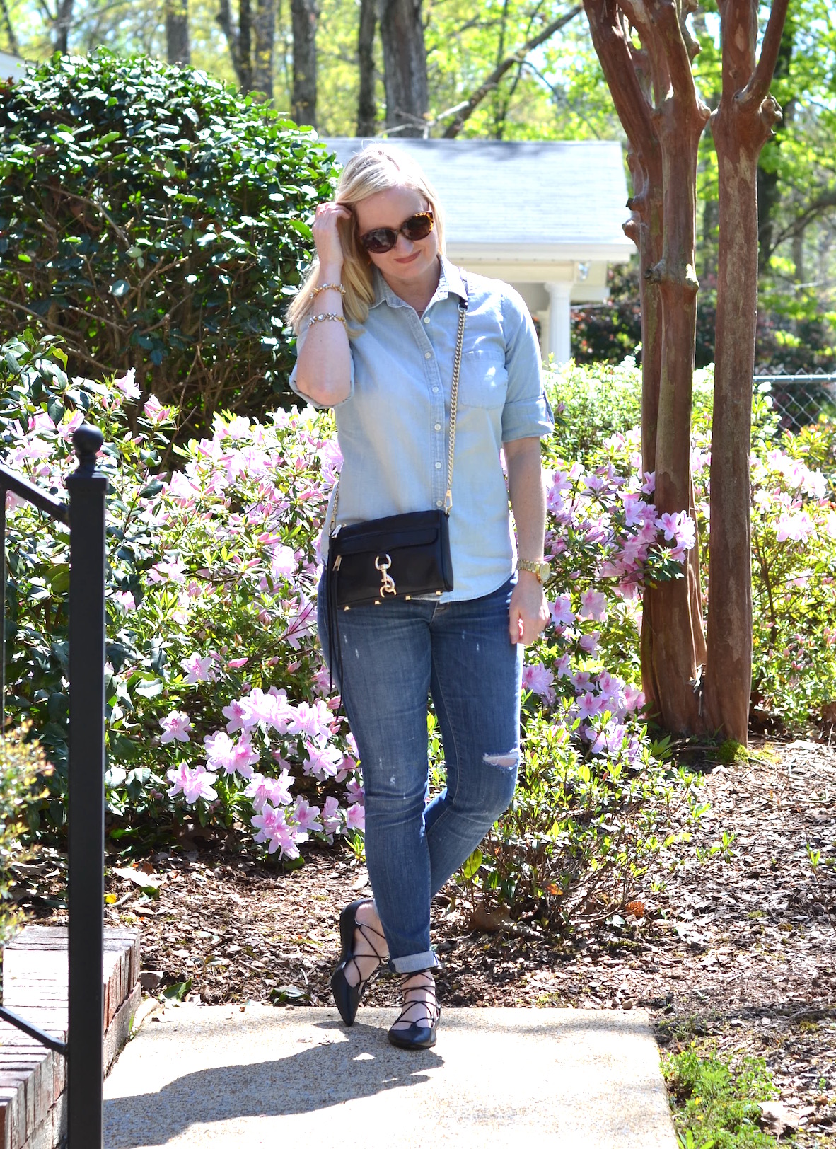 A chambray shirt and distressed denim is casually styled with a crossbody bag and lace-up flats!