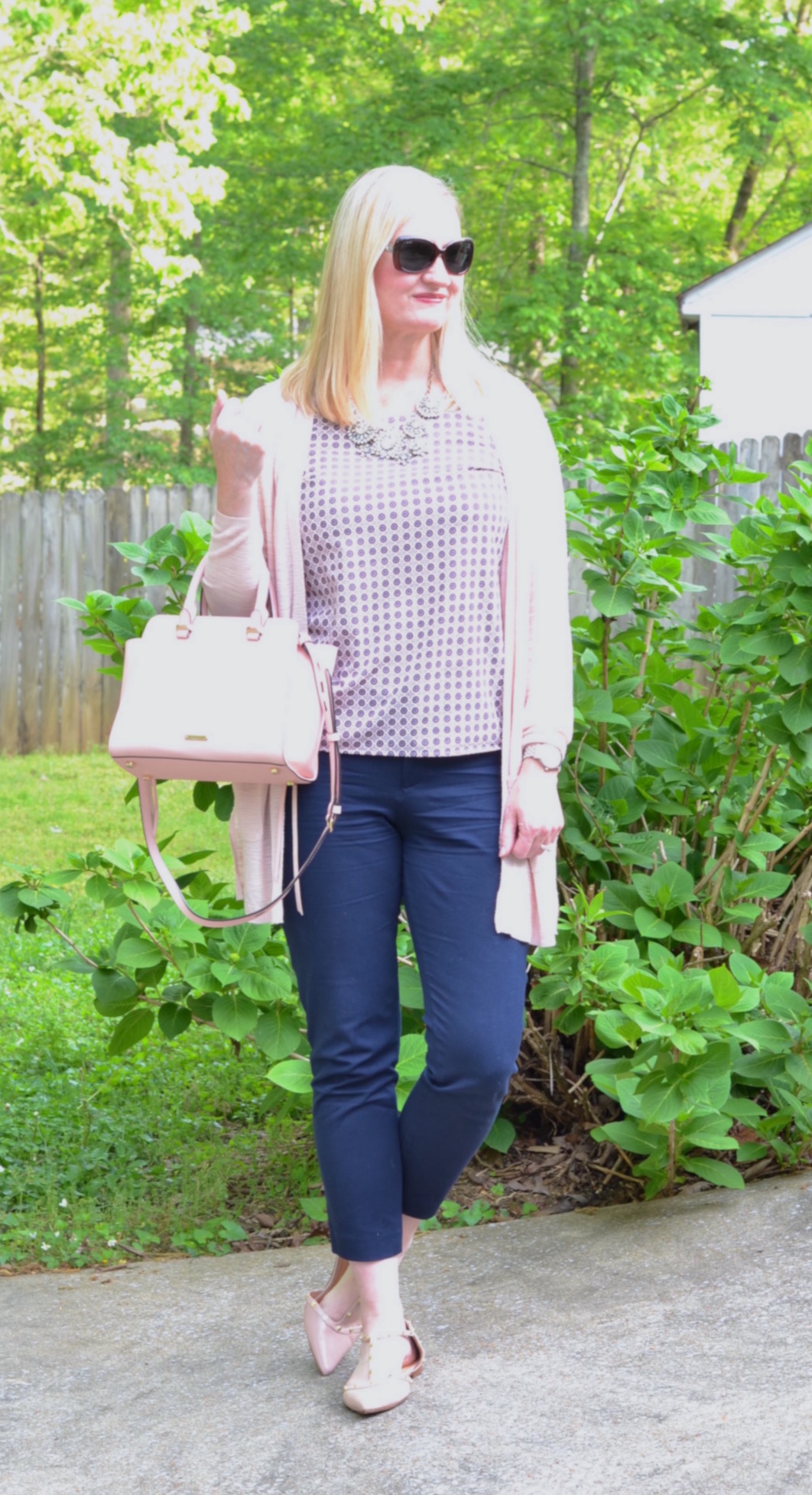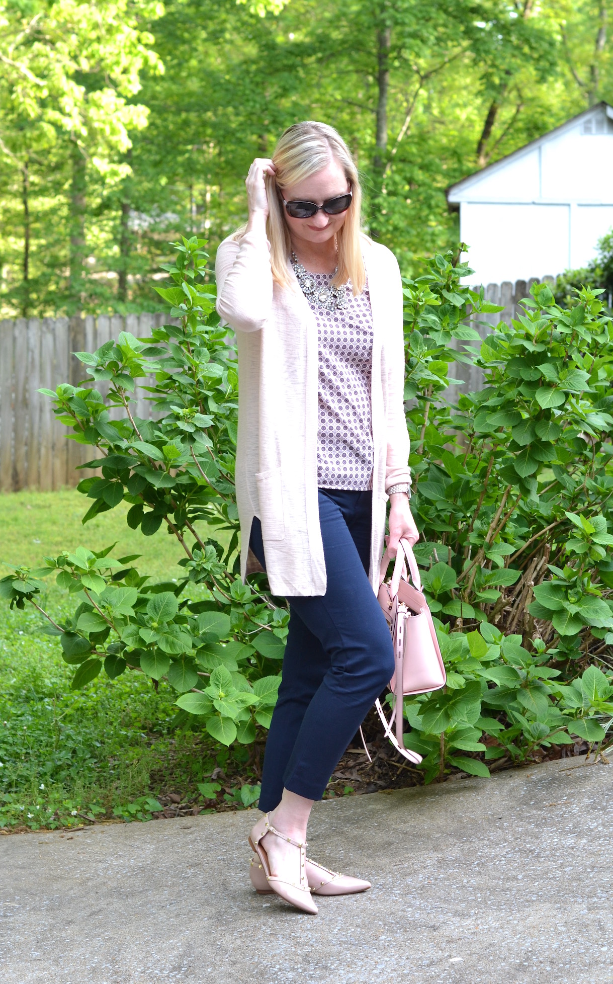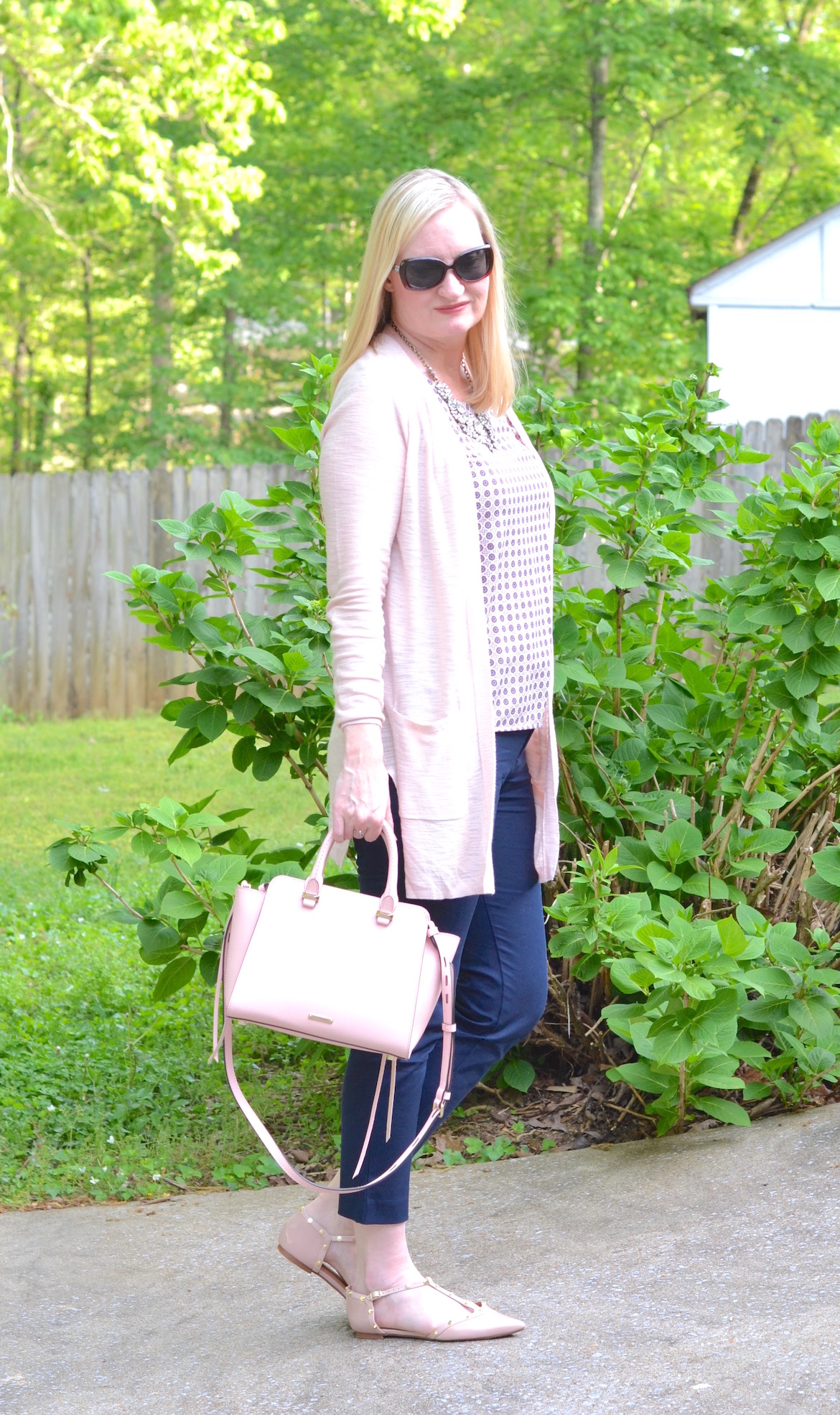 Hi there! First time linking up…came across your blog from another link up! Love your outfit and the mix of blush and navy, looks so pretty! I wear scrubs to work…so fashionable! LOL!