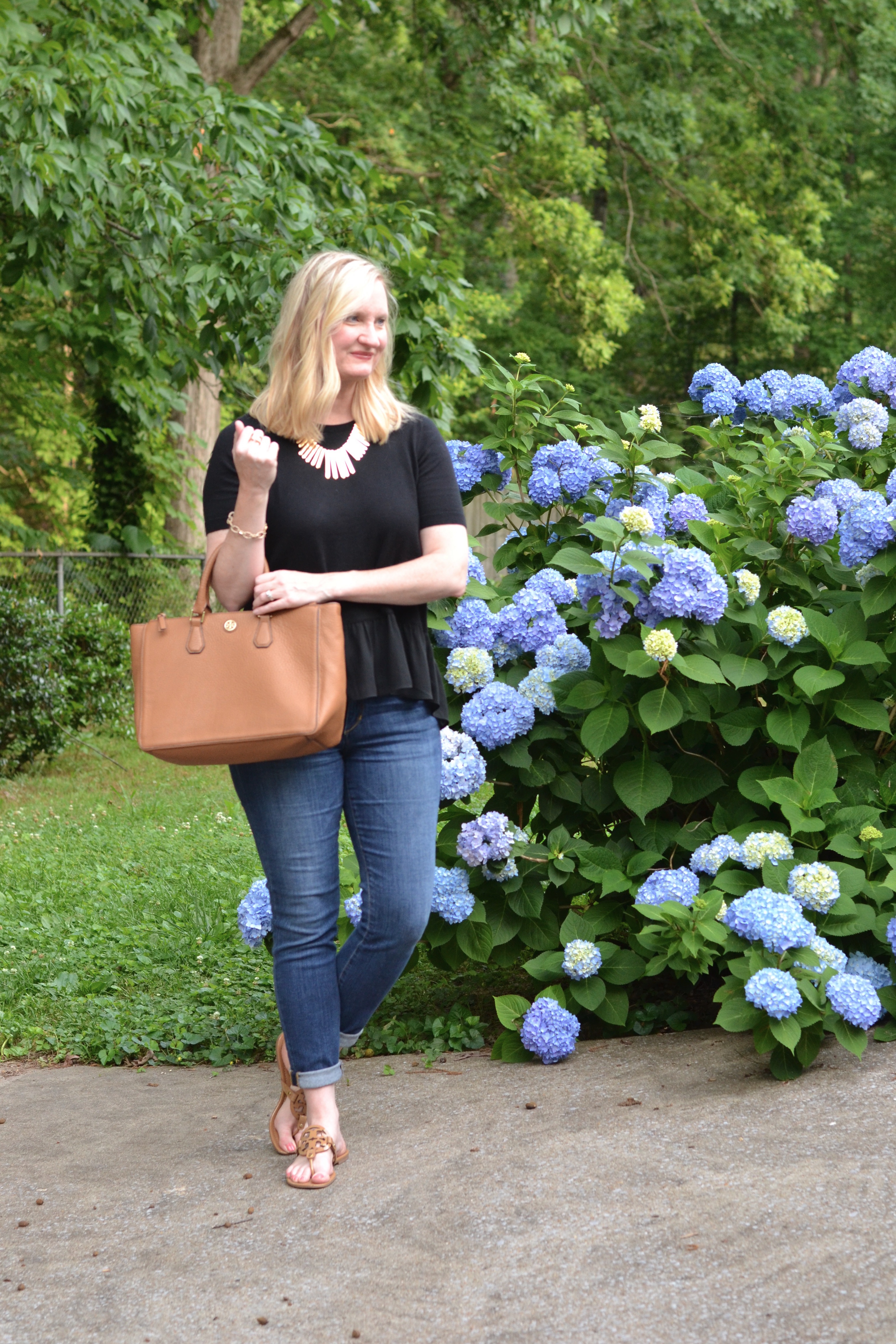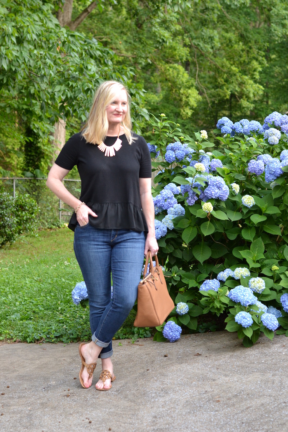 I like this peplum top! This is a style that is very flattering on most of us. I sometimes have problems with them because I have a long torso, and then they don’t fit right. You look great in the top, and your hydrangea is beautiful! Thanks for hosting the link-up, I hope you will join me on mine as well.