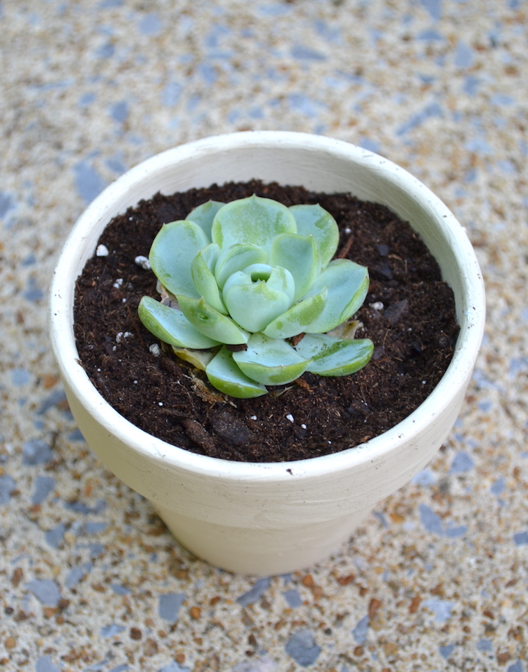 Lately, I have been wanting to try my hand at growing succulents. I have never known much about them until now. I went to a trusted source in researching: Pinterest. I looked up “how to grow succulents.” Ok, I read up all about how to grow them. Now, I actually wanted to plant some. But I didn’t have any containers small enough to plant them in. I set off to my local Lowe’s to purchase a few succulents and hopefully find some small pots. Ah ha! I found just the right size, and cheap too! But, the traditional terra cotta color wouldn’t go with anything in my house. I remembered that I had purchased a small container of Annie Sloan Chalk Paint for a project I never got around doing. It was an ivory color and would go perfectly in my office by my window!