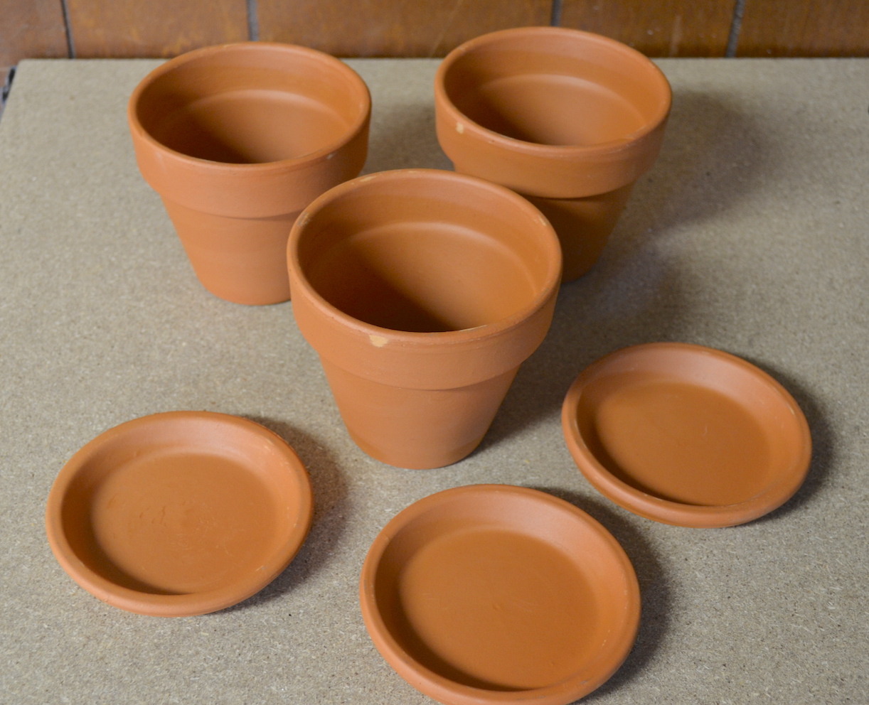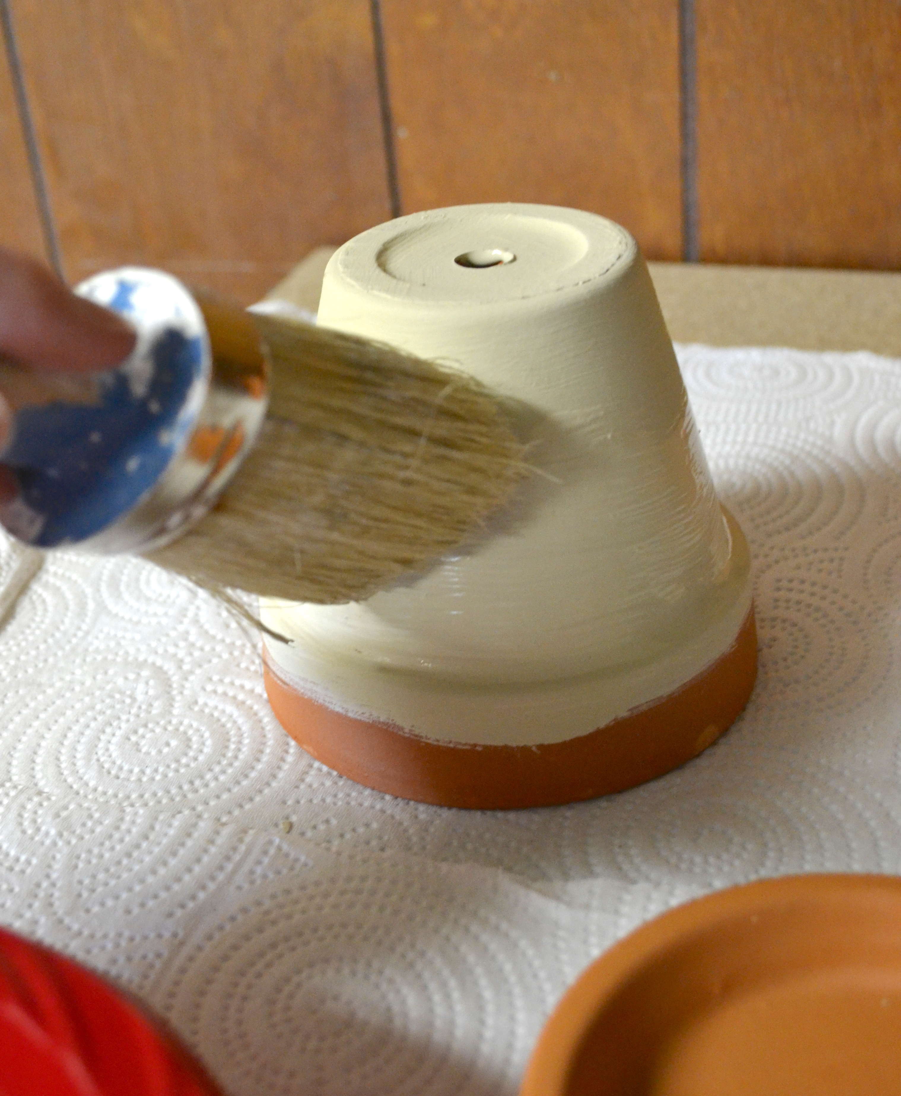 Next, spread out a few paper towels to protect your surface from paint. Paint the outside of each pot and one side of the tray.