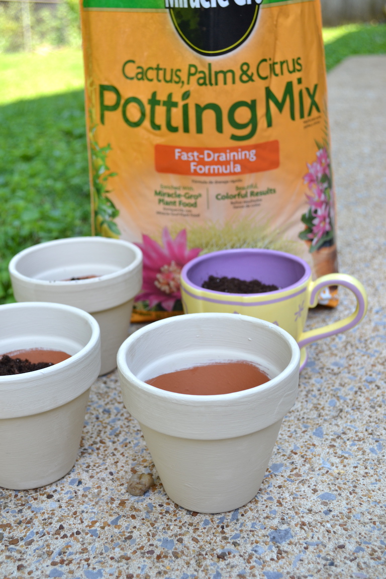 Place several of the rocks in the bottom of each pot covering about 1″ of the bottom. This is to allow drainage so the roots won’t sit in water.