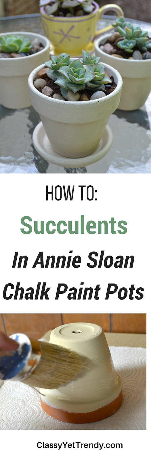 Here’s a little tutorial on how to paint pots with Annie Sloan Chalk Paint to match your decor and how to plant the succulents so they will thrive.