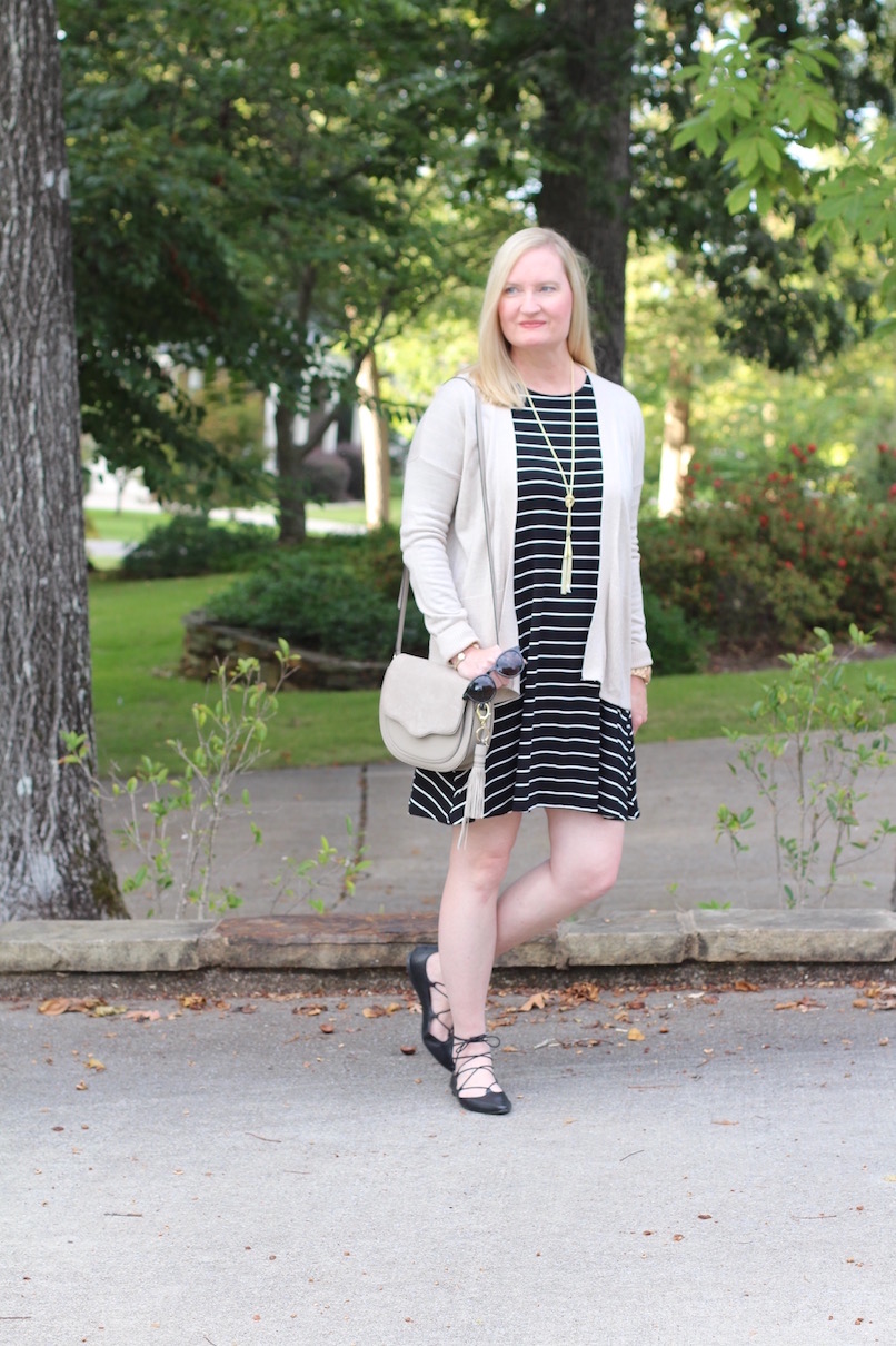 Now, on to my outfit. About a month ago, I found this striped dress at Old Navy. I had been looking for a long sleeve striped dress for my fall capsule wardrobe, that I could wear alone or layered with a cardigan or vest. When I was at Old Navy shopping with my daughter, I found it and marked it off my shopping list. I wore this exact outfit to my Hubby’s high school class reunion Saturday night. It was dressy enough but still casual to wear to the reunion.