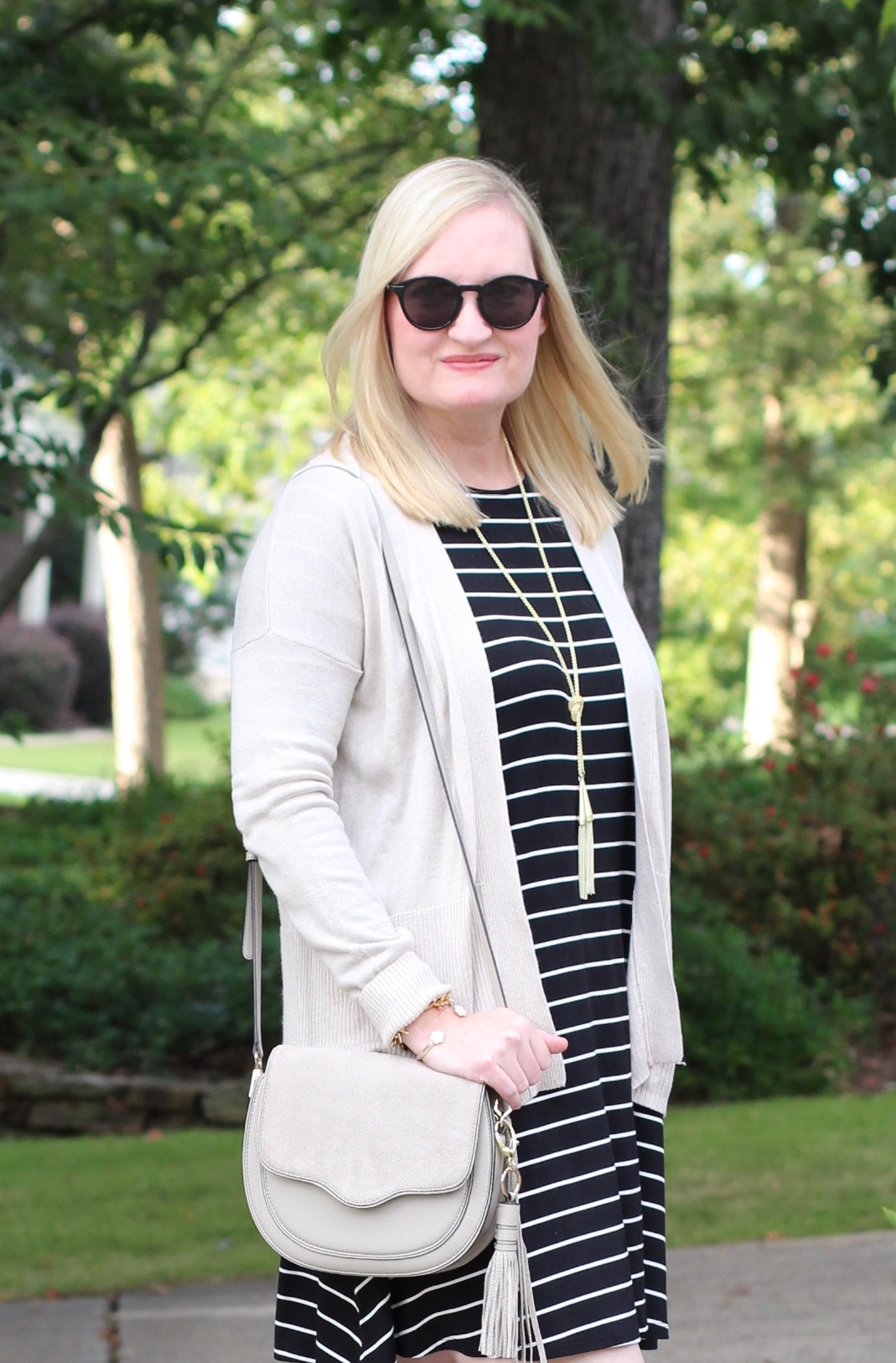 I love striped dresses and your tasseled handbag is really cute! -Melissa