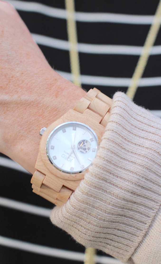 Have you ever had a self-winding automatic watch? This Jord Wood Watch is self-winding automatic. What does that mean? It doesn’t run off a battery, the movement of your wrist winds it. How awesome is that? You never have to buy a battery, ever! I owned a self-winding automatic watch years ago (another brand) and I loved it. So, I know this watch will be on repeat for a long time.