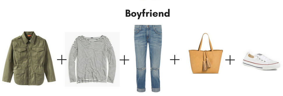 These boyfriend jeans look great with this striped top, utility jacket, tote and sneakers. Â You could wear this outfit shopping, going out with friends or going to a ball game. Â You can shop these Rag & Bone Boyfriend Jeans.