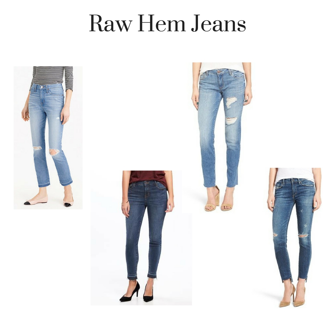 Raw hem jeans became popular a few months ago in the Fall and they are still going strong. The raw hem gives the jean an “edgy” look. They come in several washes, from light to dark and you can get them in plain or distressed.