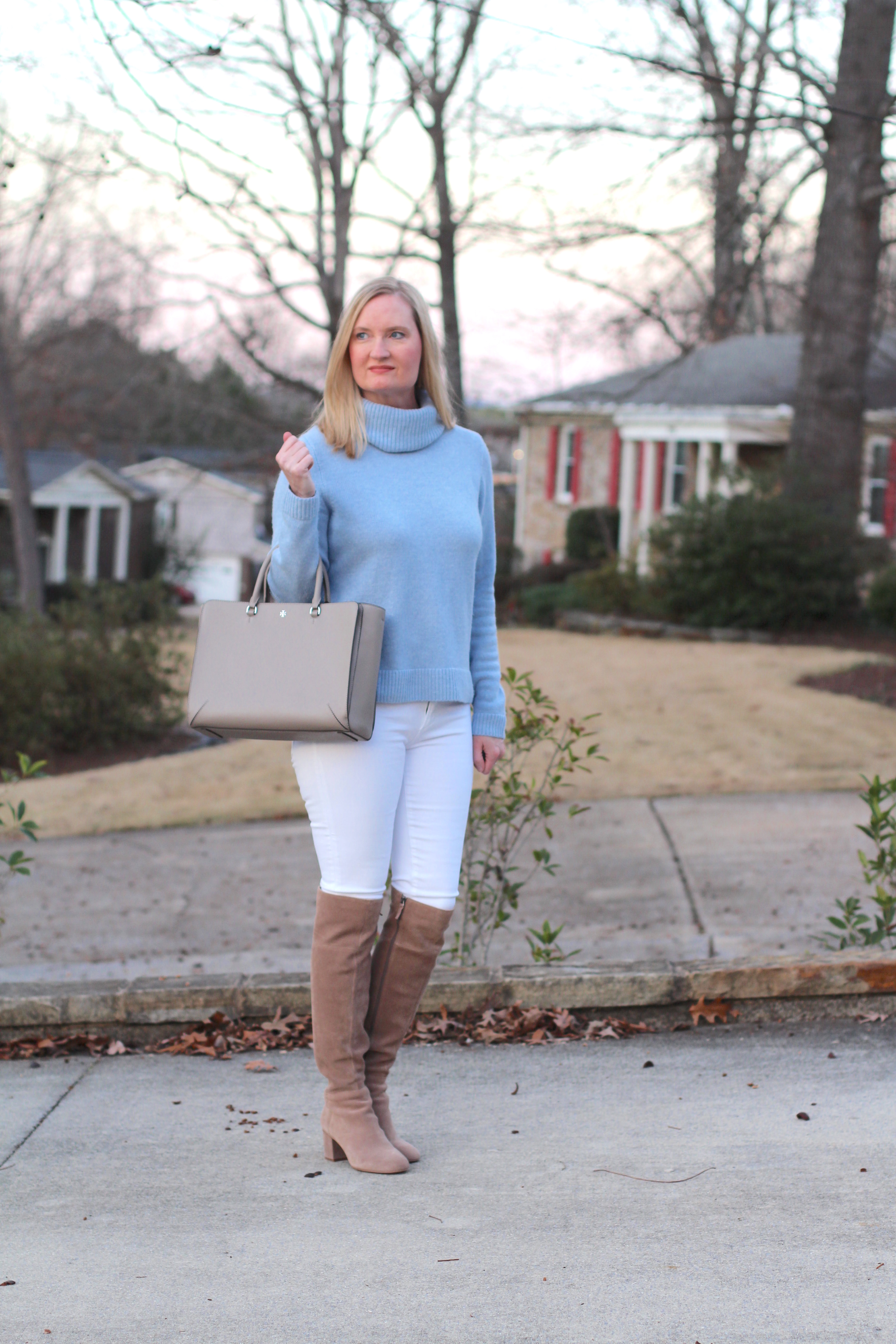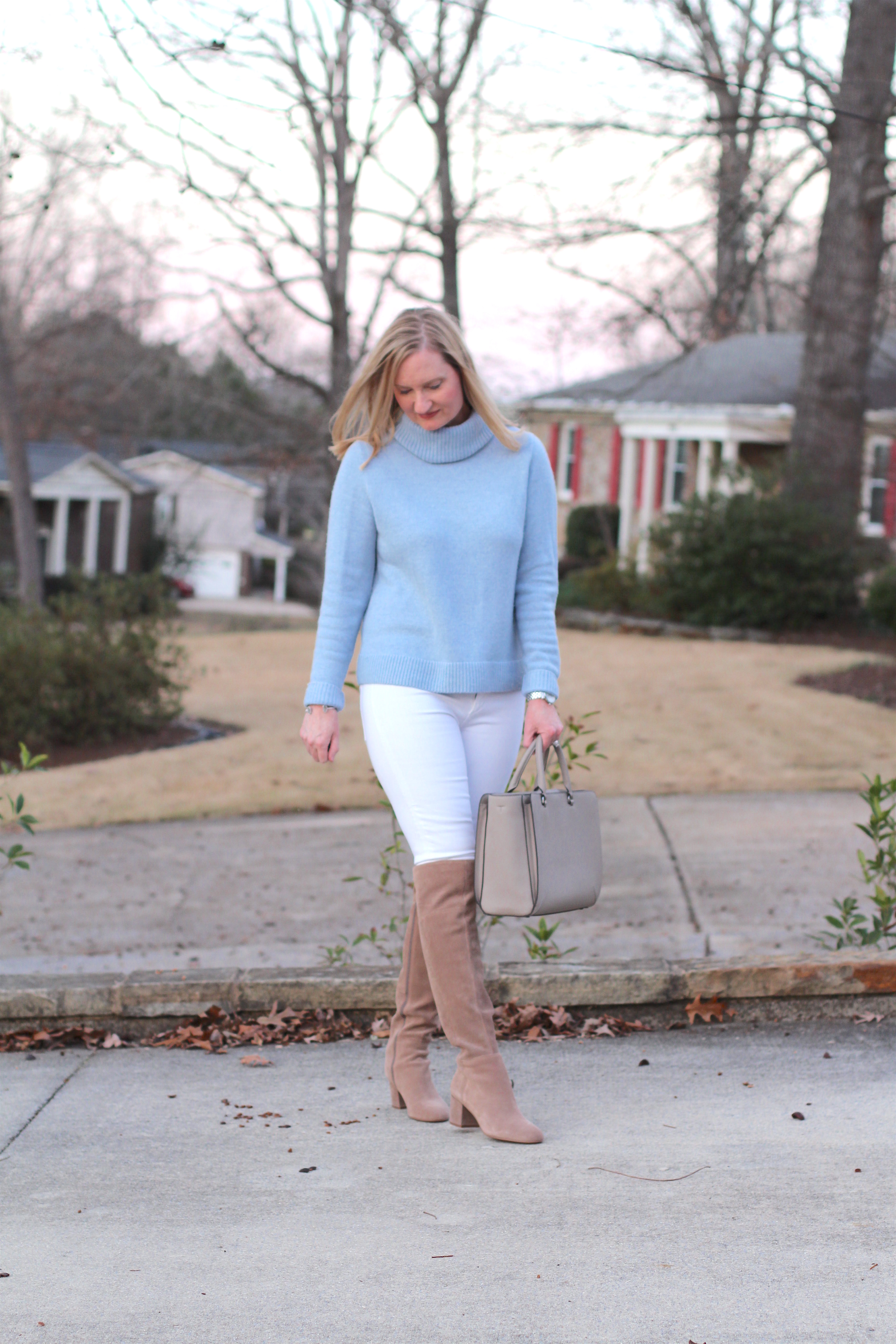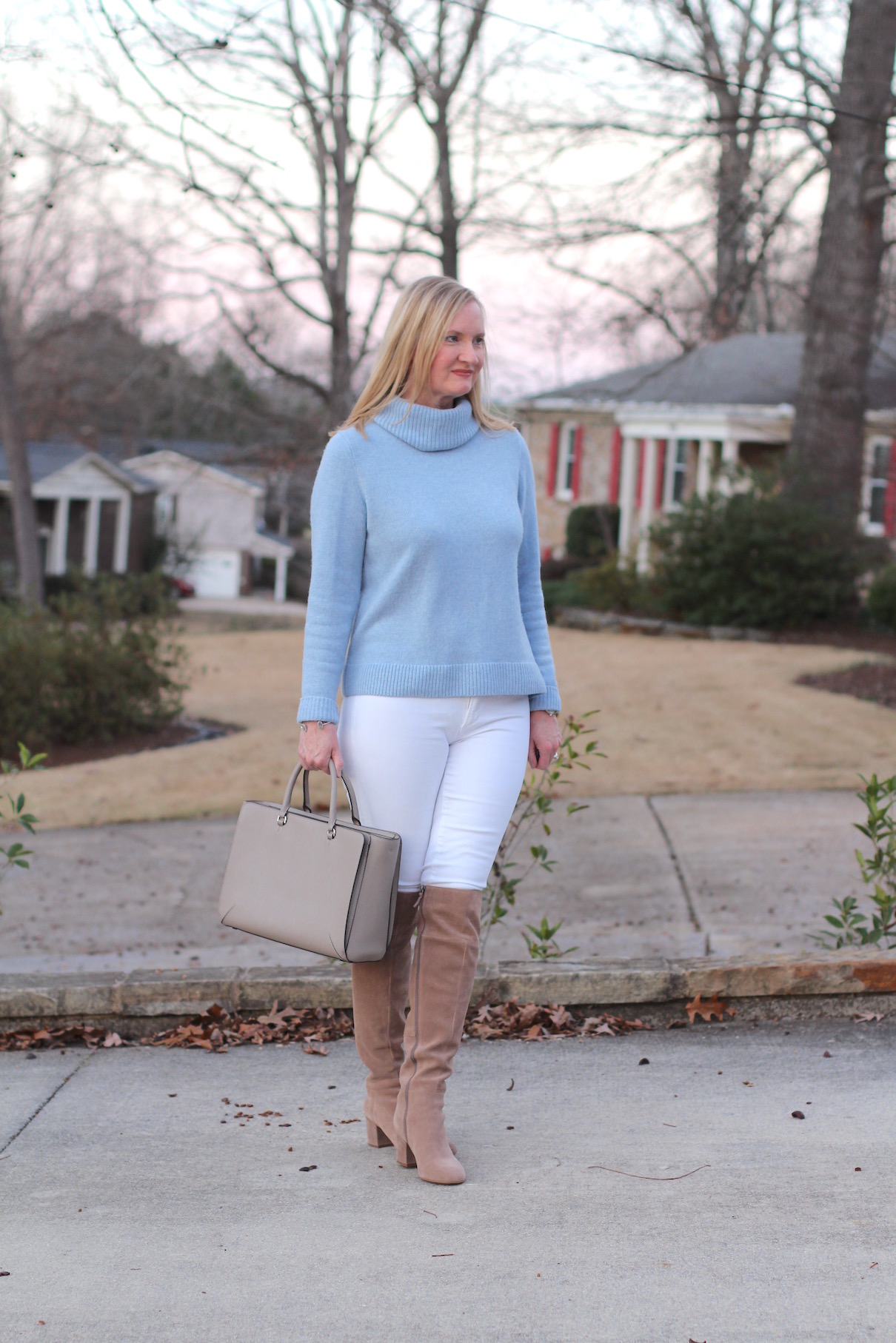 Such a pretty light look! I love wearing white jeans year round and how you paired it with the gorgeous blue turtleneck and those OTK boots is fabulous! Love the light colors for Winter!