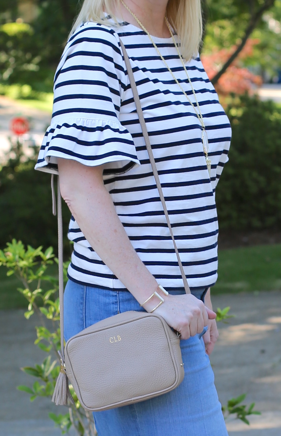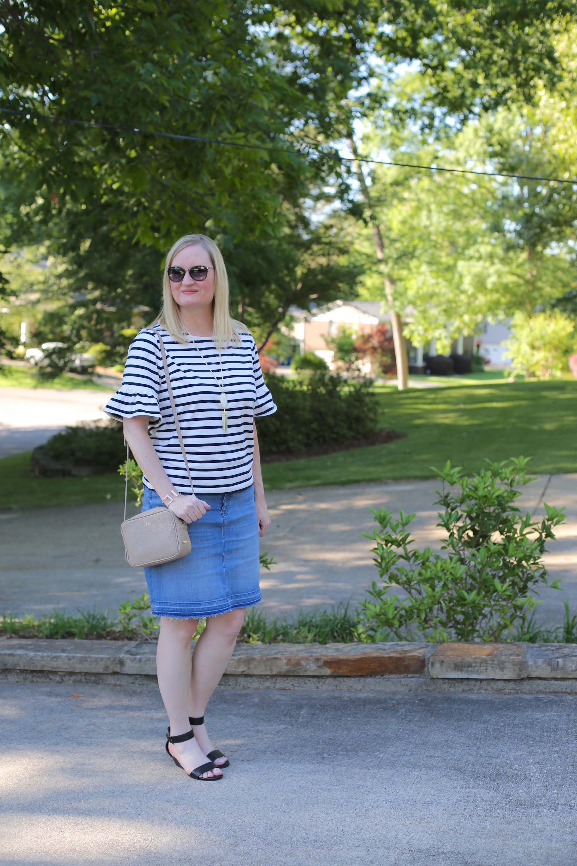 I wore this outfit to work yesterday and received several compliments on the ruffle sleeve top! ย My exact color combo is sold out, but it’s available in limited sizes in the black/white color. ย Both the top and skirt are in my Spring capsule wardrobe. ย You may remember seeing the denim skirt last year in this blog postย and in this blog post, worn two ways. ย And, I also wore it in this blog post. ย Yep, I have really gotten my money’s worth from this denim skirt!