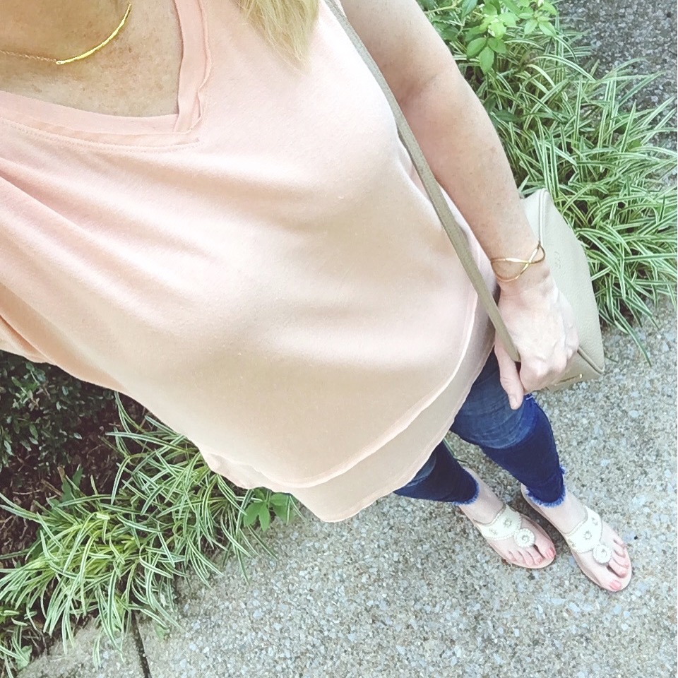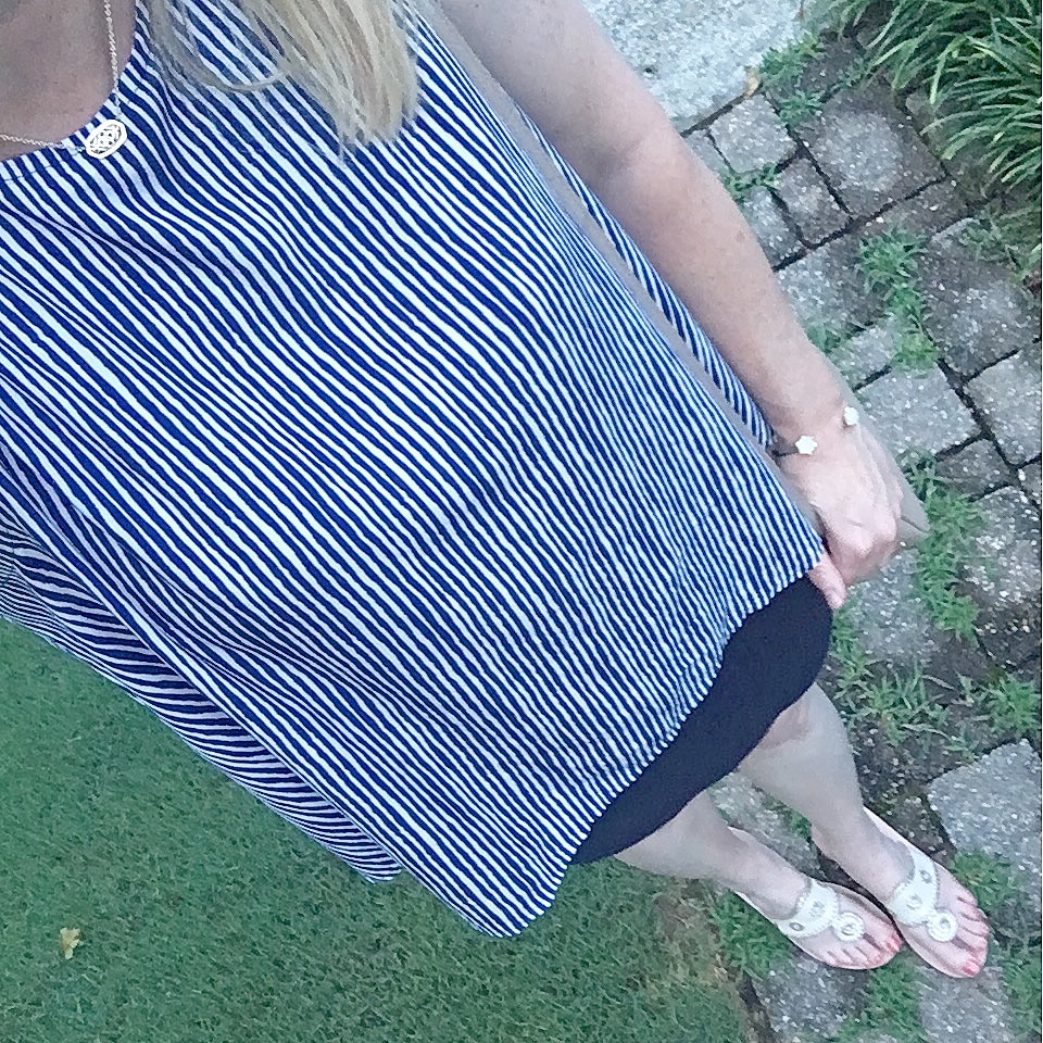 Today, I’m sharing a few outfits I posted on Instagram recently. The first one, a blue striped swing tank and navy skirt, was my July 4th outfit! I didn’t wear red, but I did wear stripes! I swapped this striped swing tank (that I found new with tags for $12) for the navy tank in my summer capsule wardrobe. The navy tank was a little too uncomfortable to wear by itself and the striped tank is a little more dressy-looking.