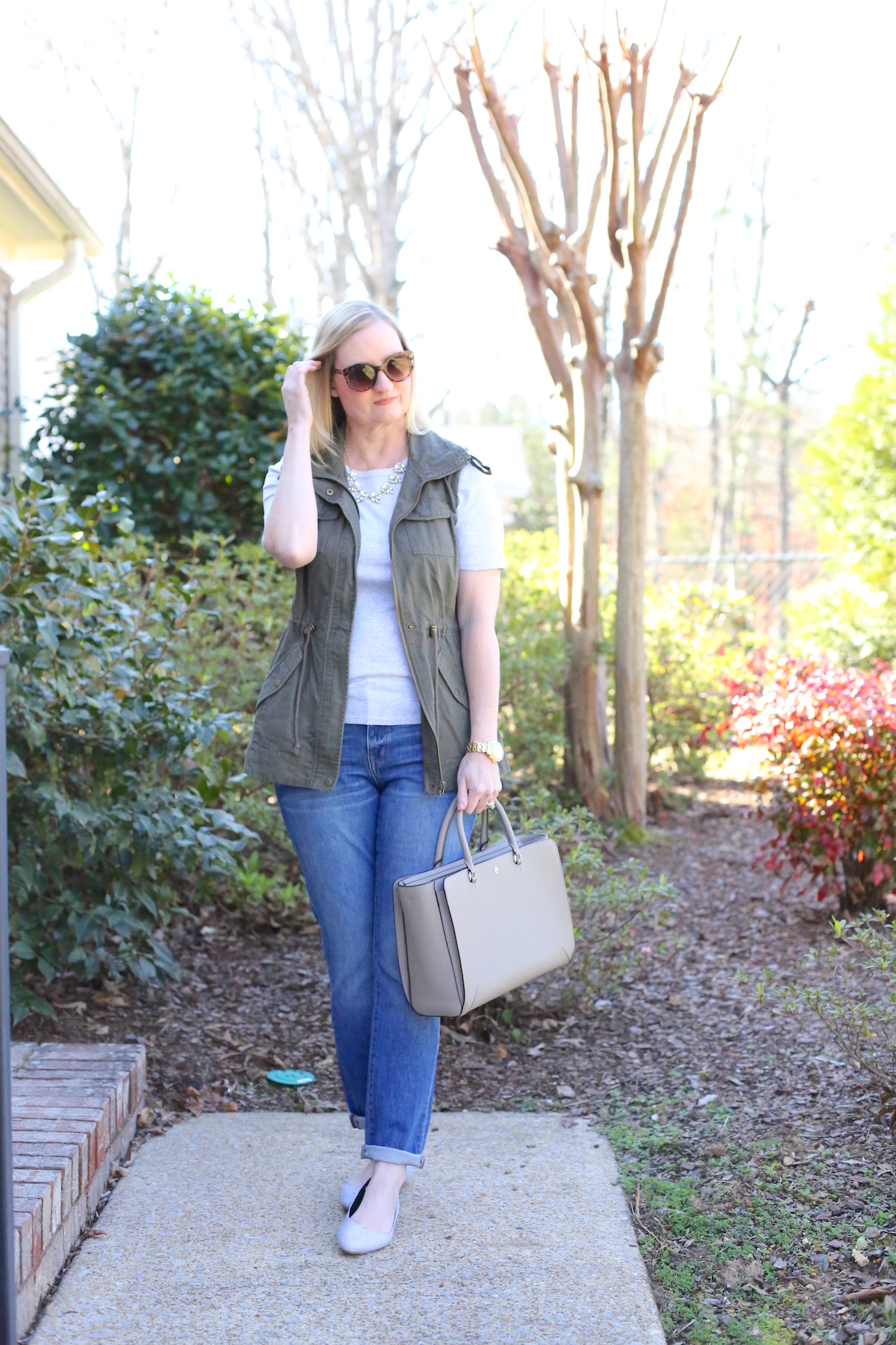 An olive utility vest is one of just 20 clothes and shoes in my Fall eBook, The Essential Capsule Wardrobe: Fall 2017 Collection.ย In the eBook, I show you how to create your own capsule wardrobe, from start to finish and what clothes and shoes go in it.ย Plus, there is a 100 outfit ideas visual guide, a travel packing guide, a checklist and more!ย Click here to get your copy!
