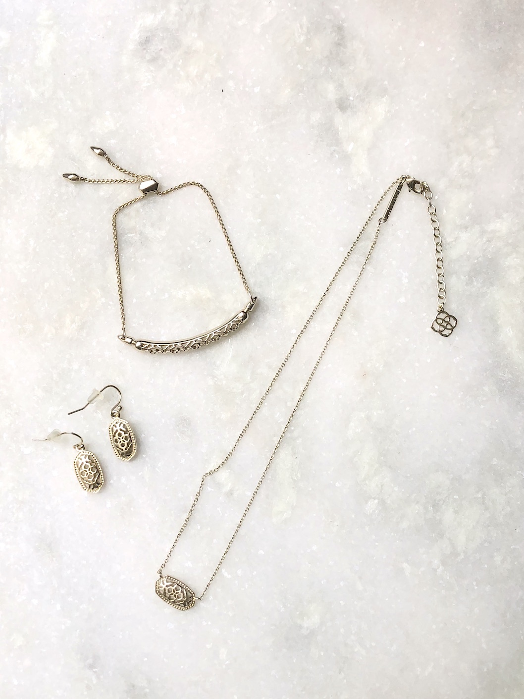 Up next, are the Filigree jewelry collection. These pieces are iconic Kendra Scott and are easily recognizable. I bought the Gilly Adjustable Chain Bracelet in “gold” in the Nordstrom Anniversary Sale on major sale! (sale ends August 5). Also pictured in the photo below is the Gold Elisa Filigree Necklace and the Lee Gold Filigree Drop Earrings.