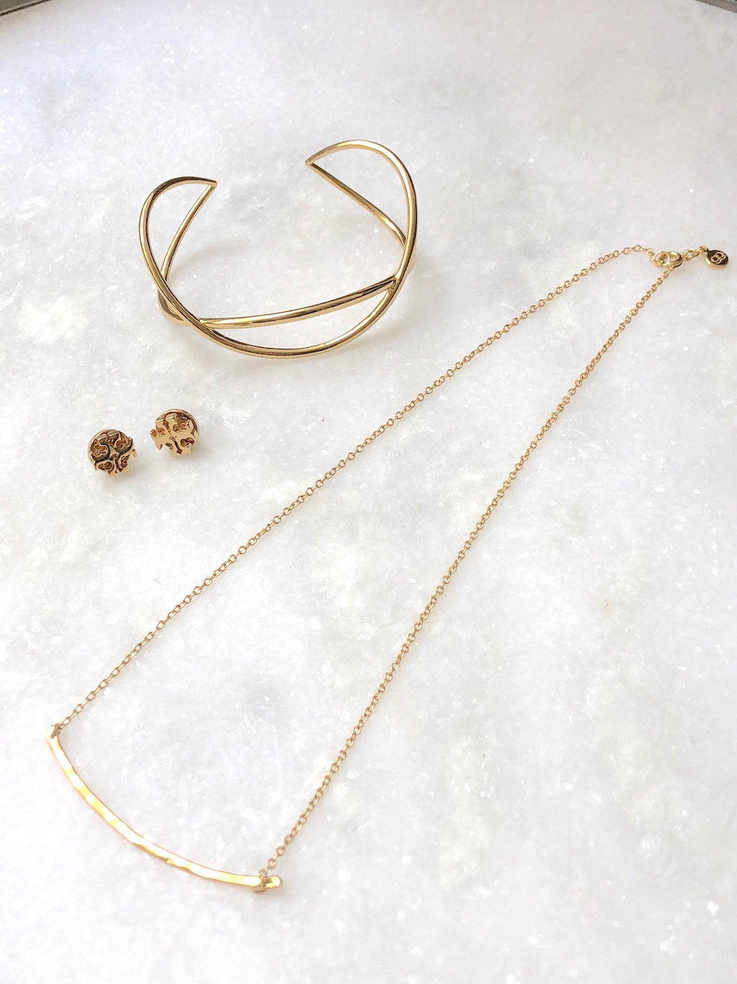 Another favorite brand is Gorjana Jewelry. I first discovered Gorjana while browsing on Shopbop. The bright goldtone caught my eye. I ordered the Taner Bar Necklace (shown below) to see what it looked like in person. I absolutely loved the 18k gold plated design and the gorgeous gold tone easily made this a favorite necklace right from the start! I later ordered the Autumn cuff bracelet, shown below (similar to the current Elea Cuff Bracelet). I also have a pair of the Tory Burch Logo Stud Earrings (see photo below), which coordinates perfectly with the Gorjana jewelry.