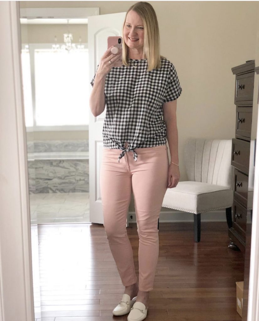 Gingham Tie Front Top / Jen7 Skinny Ankle Jeans / White Mules (this year’s version Under $23!)