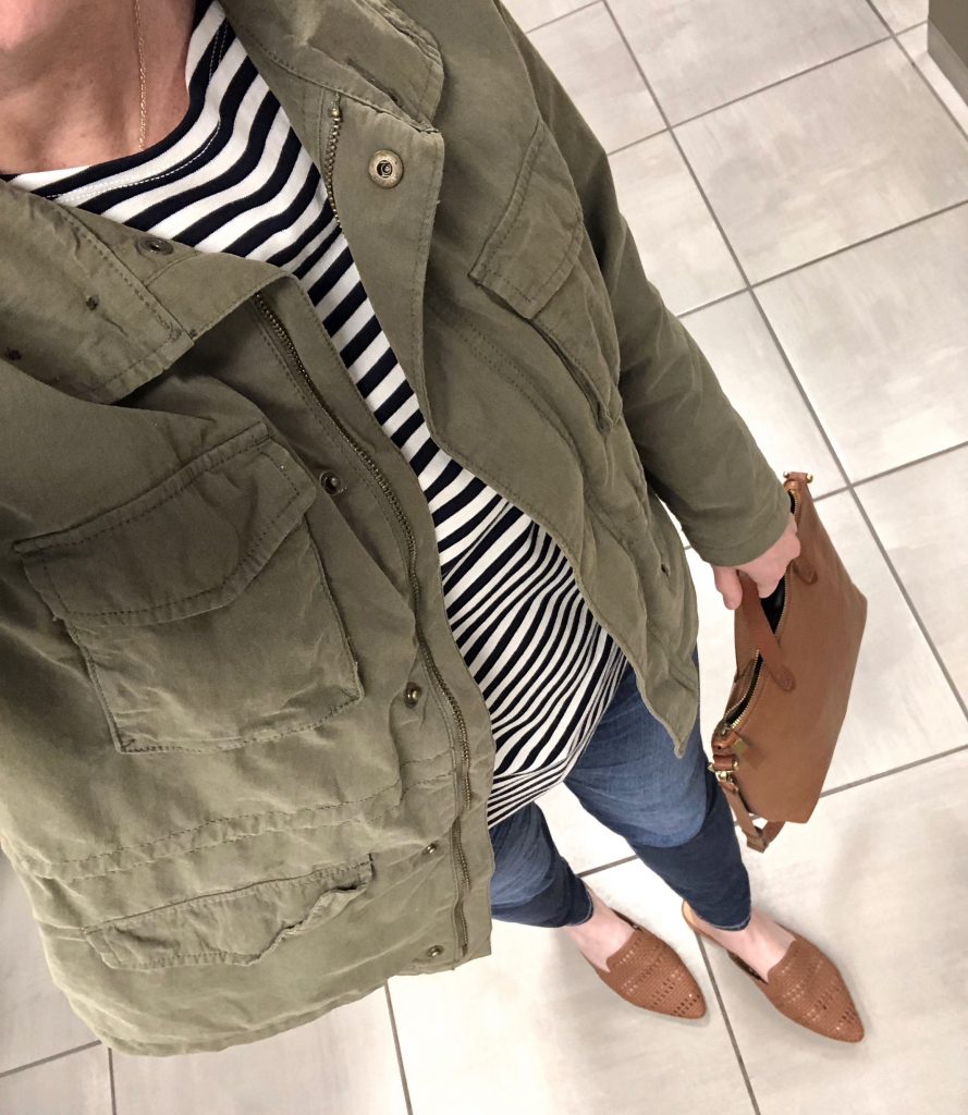 This outfit is a no-brainer! Stripes, jeans, utility jacket and mules. It’s simple, comfortable and easy to wear.