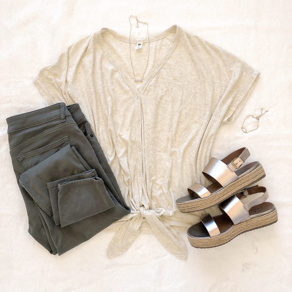 I shared this #flatlay of my #OOTD (outfit of the day) on Instagram that I wore the other day. The Button Front Knot Hem Tee is on sale for 40% off! These Jaycie Leather Flatform Espadrilles in Bronze Metallic are new this Spring. They are the Bronze Metallic color and they also come in black and dark brown. What I love about these is that they are so comfortable it feels like walking on air! Plus, the bronze metallic color is a neutral so they match all your outfits.