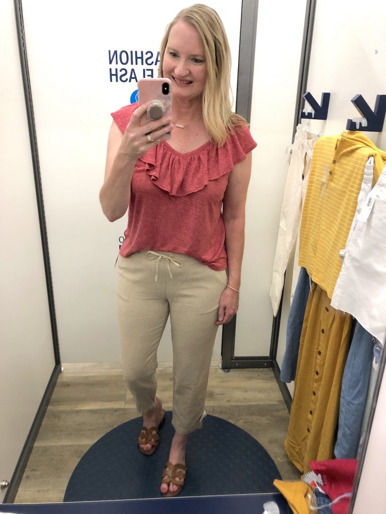 I saw a few pairs of the beige linen tapered drawstring pants, but not in my size Large, so I tried on a Medium just to see how they looked on. The Medium was a tad bit tight, but I love the style of them: the drawstring waist, the slightly cropped length, the softness of the fabric and the color too. They also had them in the store in the black color, but because I’m particular with what I buy to include in my capsule wardrobe, I’m set on just adding a beige pair as they will go with several tops in my capsule. With the pants, I also tried on the Ruffle-Trim Linen-Blend Top in “antique coral” in a size Large. I didn’t buy the top since I have all the tops I need in my Summer capsule wardrobe, but I loved the color, fit and style of it! If they would have had the pants in a Large, I would have bought the pants.