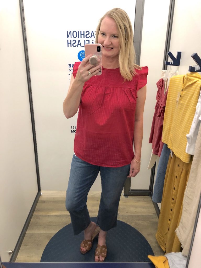 I tried on the High-Rise Secret-Slim Pockets Flare Ankle Jeans with this Smocked-Yoke Ruffle-Trim Sleeveless Top in “pink tangiers” in a Large. I should have tried on a Medium as it was a bit wide, but I loved the color and the ruffle detail on the shoulders. You could wear this top with jeans or shorts and can even wear it to work with a skirt or pants.