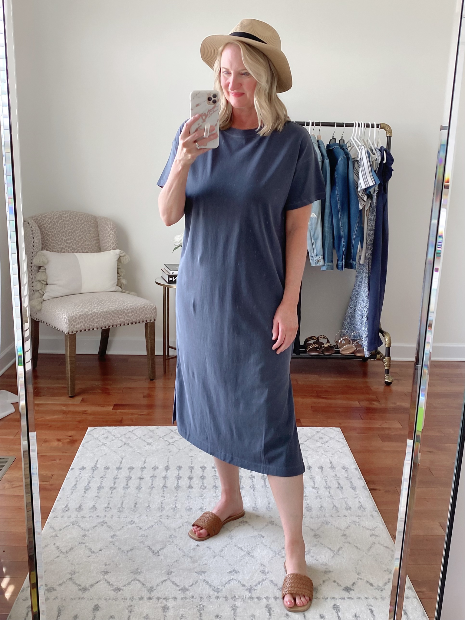 Next is this Garment-Dyed T-Shirt Midi Dress in the “volcanic glass” color (wearing a Large). The color on this one looks more muted than the one above and is a straight style also. It is a cotton jersey material with a crew neck and side slits at the hem. It also comes in a “warm hickory” color, which looks like a pretty deep peach color. You could add a belt around the waist for a more fitted look. I’m also wearing the Madewell Packable Fedora Straw Hat and the Madewell Liane Slide Sandals in the “english saddle” color.