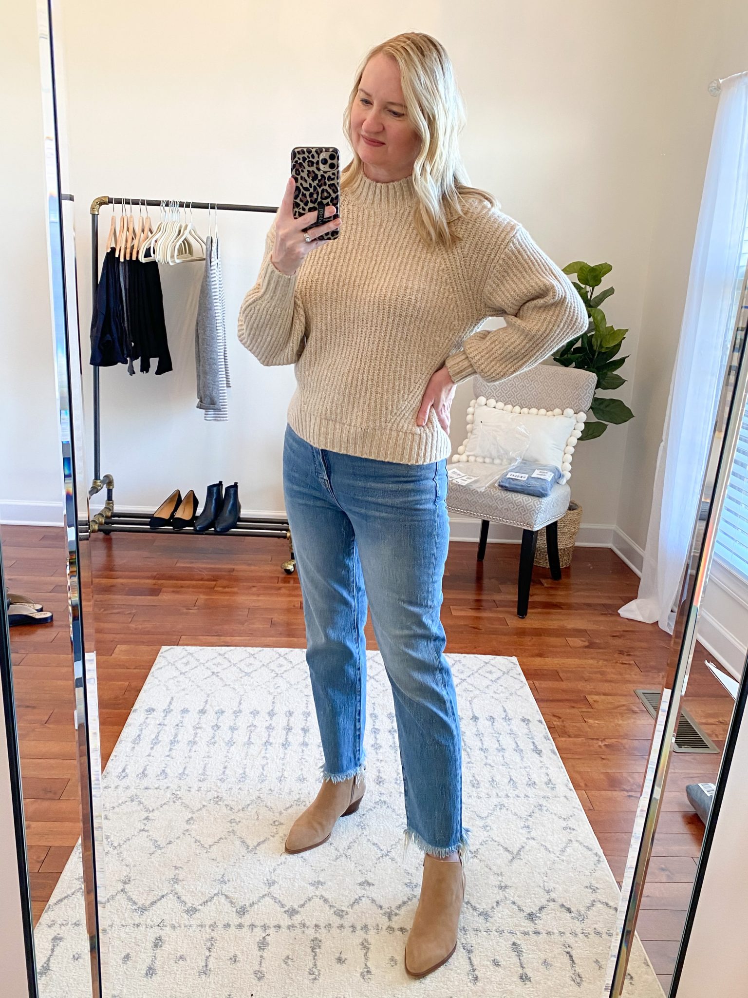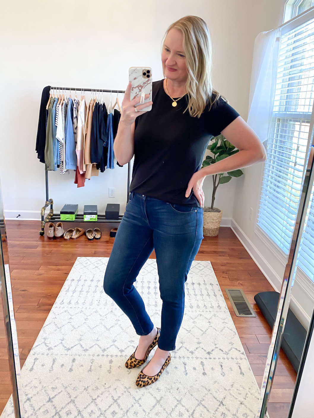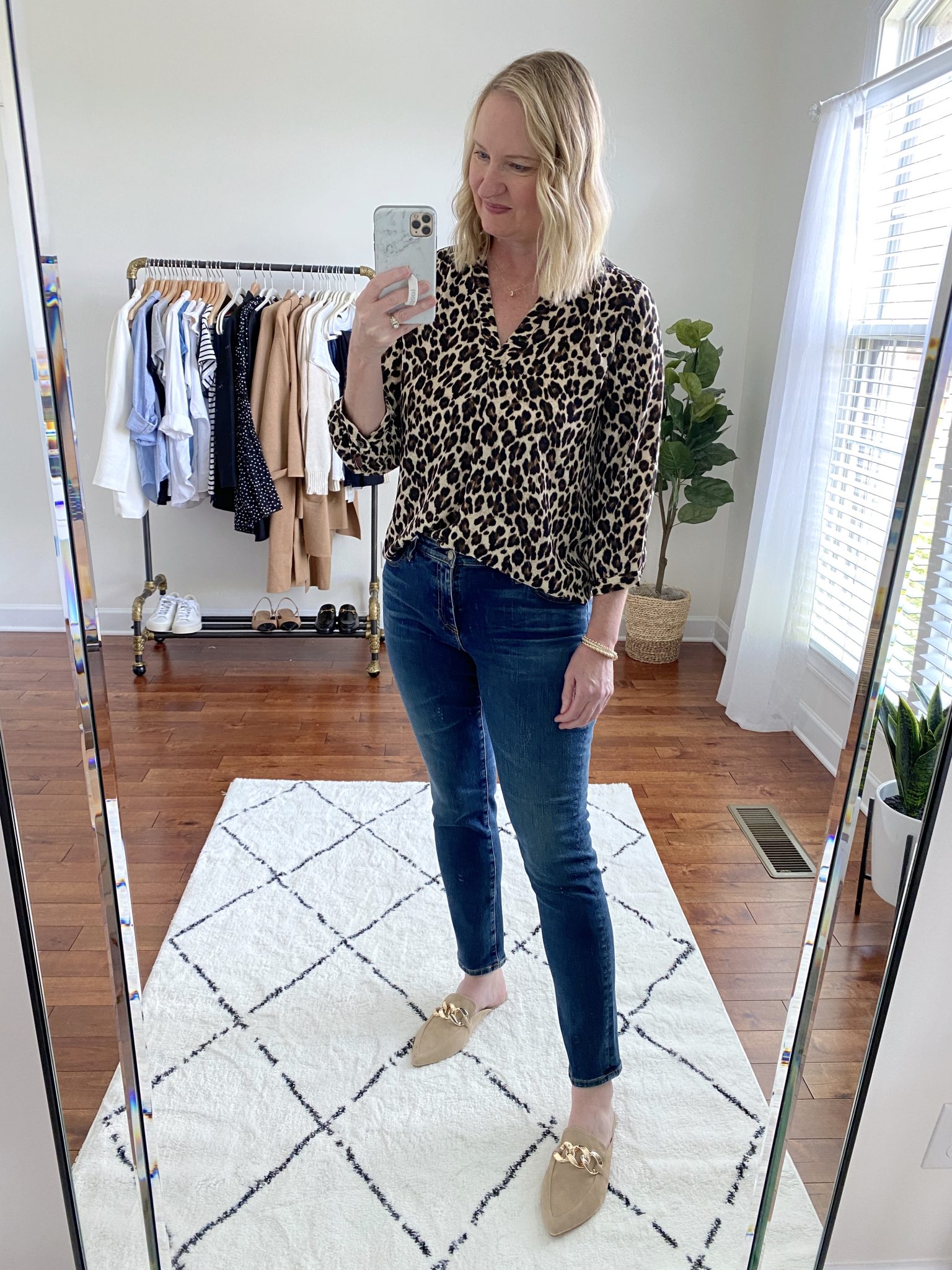 wearing the Steve Madden Finn Mules / also wearing this Vince Camuto Leopard Top