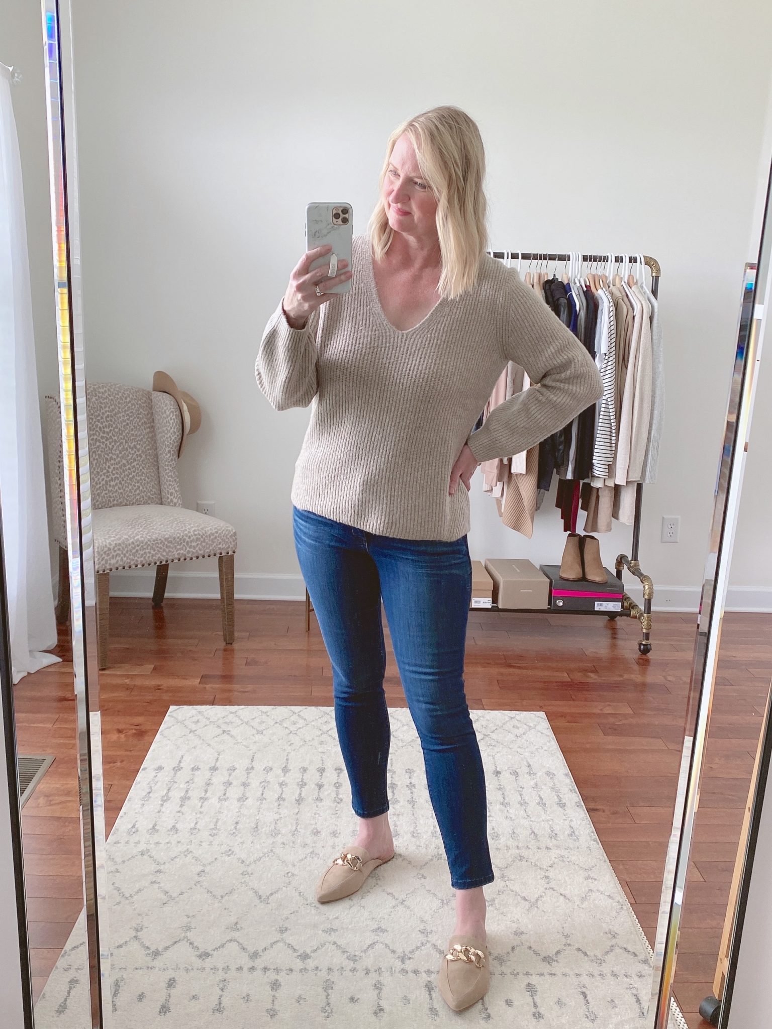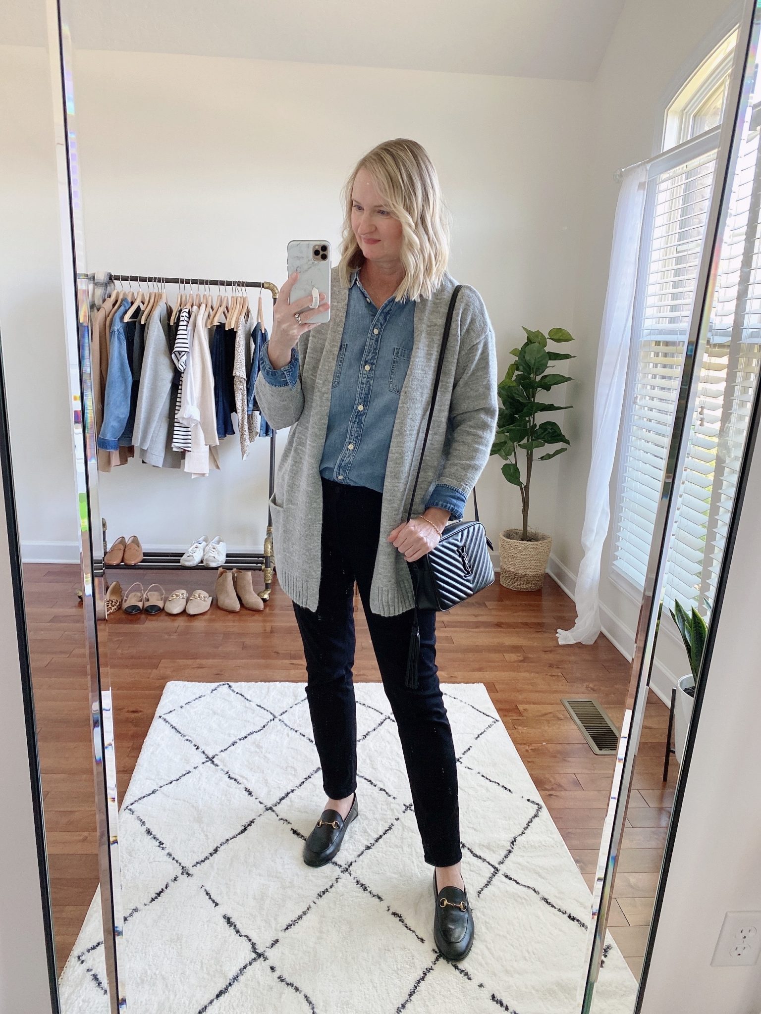 One of my favorite style of shoes to wear are loafers & mules! Since mules have the same shape as loafers but just without the back of the shoe, I put these in the same category. I love the classic style of a loafer and mule and they go with so many outfits! You can wear them dressy with pants or a skirt or wear them casually with jeans. I have two pairs of loafers and one pair of mules in my Fall capsule wardrobe! Here are a couple of them that I have been wearing a lot, the Gucci Brixton Loafers and the Steve Madden Finn Mules. Nordstrom also has the Sam Edelman Lior Loafers, which are a similar style as the Gucci but more affordable.