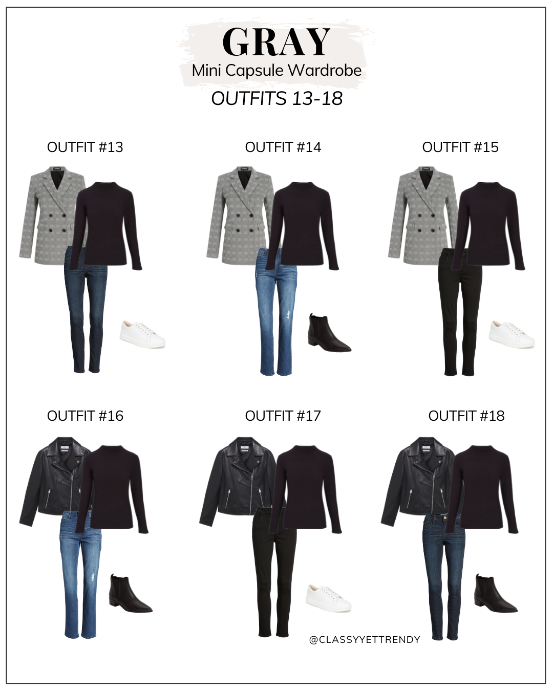 In this post, I am showing how to style 10 pieces using gray as the accent color and create 18 outfits. This is a “mini” capsule wardrobe, which has fewer pieces than a capsule wardrobe for a season.