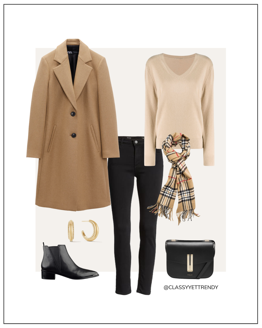 This Zara camel coat, camel sweater (similar style) and ecru color jeans are all similar tones of colors. The black loafers (love these loafers too), black Chanel bag (also love this bag) and black plaid scarf (similar) all add a different color tone to the outfit.