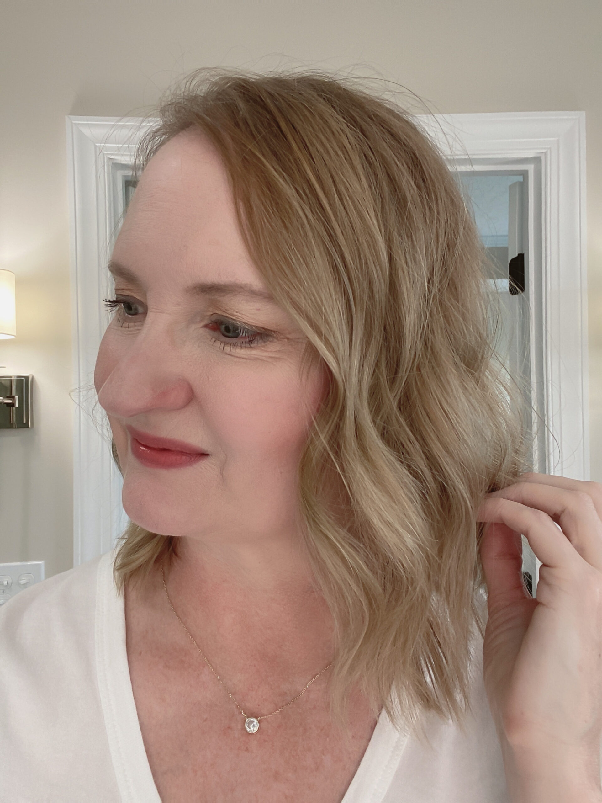A few months ago I changed my hairstyle. My hair was a longer length, which was heavy for my fine texture hair and I it was a bit too blonde for my cool skin tone. I had my hairstylist cut my hair shoulder length and add some light layers throughout. She also darkened my hair color to my natural hair color with just a few highlights. I absolutely LOVE it now and it is SO EASY to style!