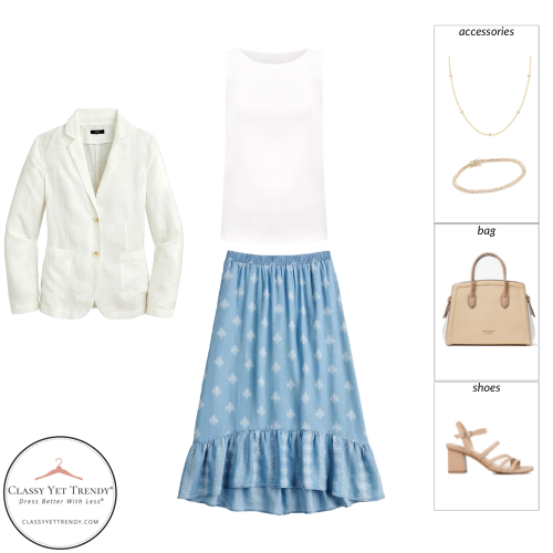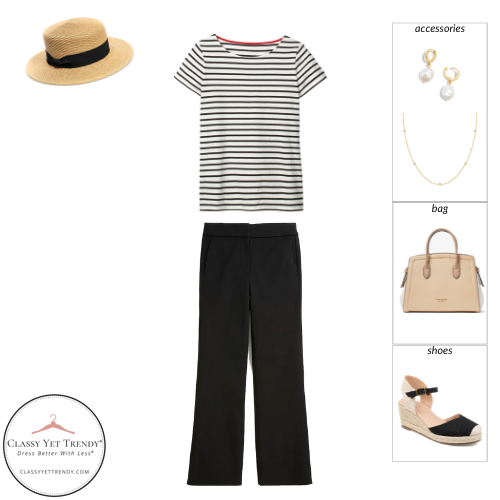 For several years, the French Minimalist season series has been one of the most popular capsule wardrobe collections here on Fashion Elo. This series has a mostly neutral color palette with light blue being the only accent color which coordinates well with the other pieces in the capsule. Each season, the clothes and shoes in the collection are inspired by the styles of France with stripes, feminine details and dressy styles.
