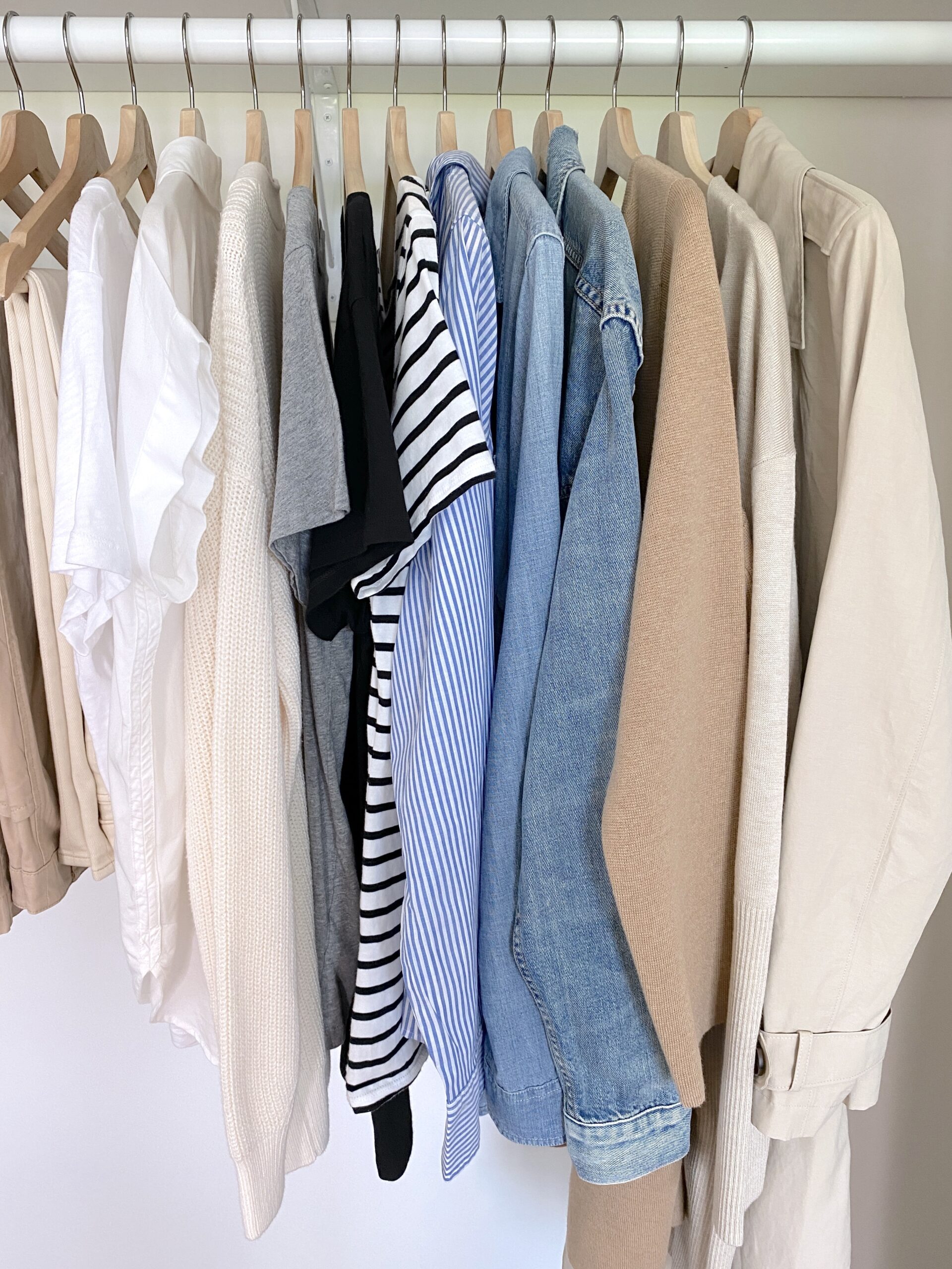 When I create a capsule wardrobe, I select my tops first, I guess it’s maybe out of habit, but you can also start building your capsule by choosing bottoms or shoes first! To give you a visual of what a capsule wardrobe looks like on a clothes rack, here is what my capsule looks like on my clothes rack in my studio room…